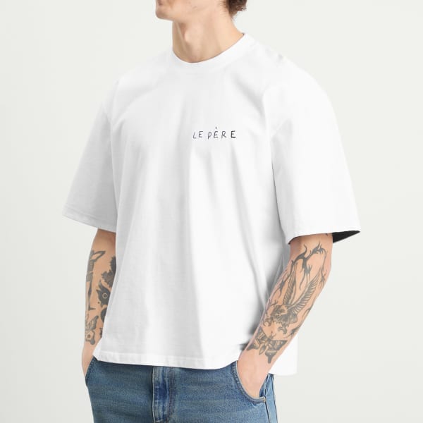 le PÈRE, современный бренд, известный тем, что преображает базовые вещи гардероба, приглашает вас обновить свой базовый гардероб с помощью футболки с двойным рукавом. Изготовленная из высококачественного португальского хлопка, футболка имеет фирменный дизайн с двойным рукавом и контрастную подкладку, создающую эффект многослойности. Футболка имеет свободный силуэт с четкой кокеткой на спине и украшена вышитым от руки логотипом le PÈRE на груди.