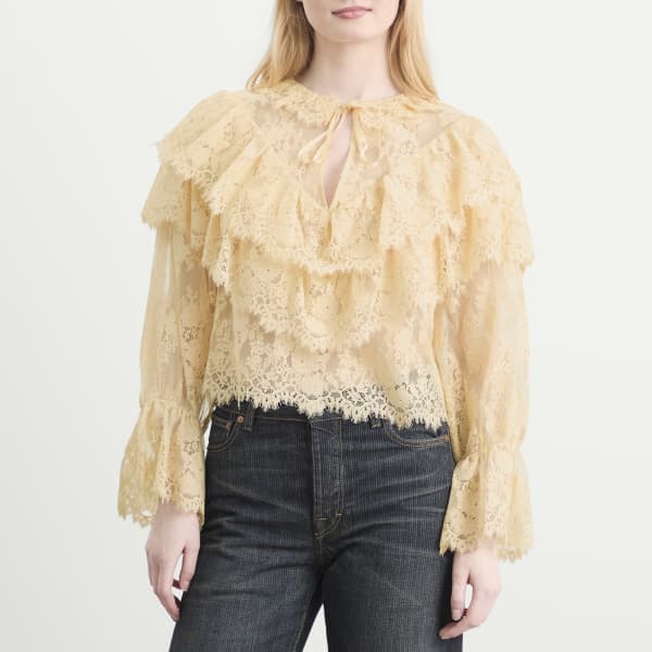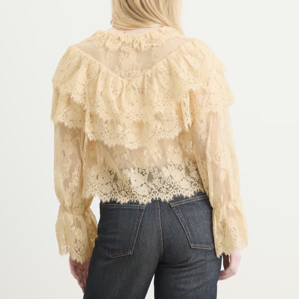 В топе Faryn от RIXO воплощена суть винтажного драматизма. Вдохновленный богемным стилем 1970-х годов, этот эффектный элемент гардероба выполнен из нескольких слоев нежного кружева с оборками. Благодаря своему театральному шарму и вневременному силуэту, топ Faryn олицетворяет фирменное сочетание ностальгической элегантности и современной женственности от RIXO.