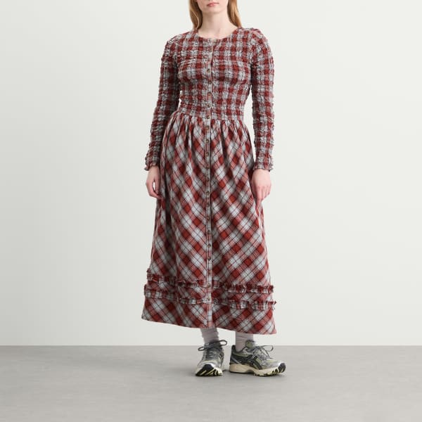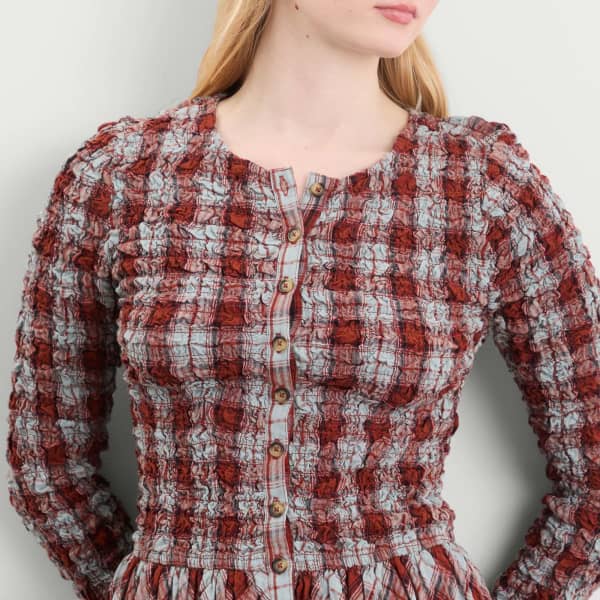 Мягкая структура, продуманные детали и оборки объединяются в кардигане-платье Damson Madder Posey. Изготовленное из хлопка, оно сочетает в себе верх в стиле кардигана с застежкой на пуговицы и присборенный лиф, который мягко и комфортно облегает фигуру. Многослойные оборки по низу добавляют движения и очарования, а клетчатый принт придает платью вневременной шарм. Это простая вещь с многослойными деталями.