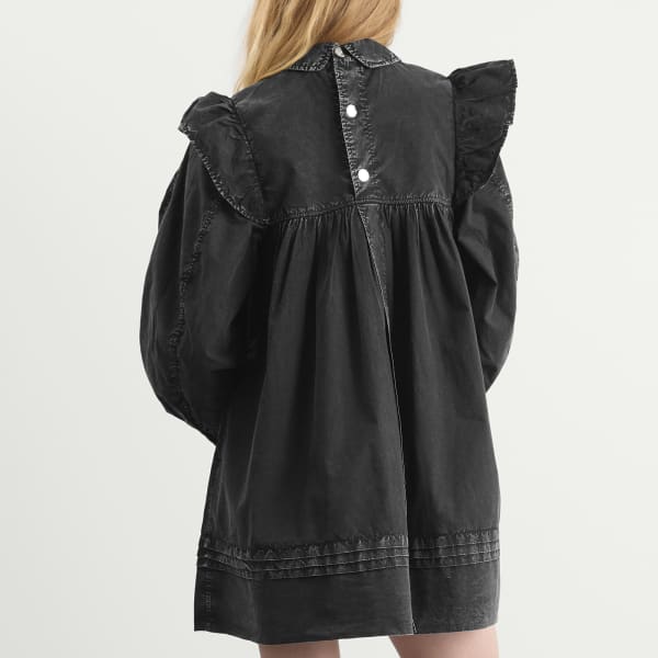 GANNI, копенгагенский бренд, известный своей игривой женственностью и непринужденным стилем, воплощает это фирменное очарование в мини-платье с оборками. Органический хлопок придает ему мягкость и ощущение поношенности, а смелые оборки на плечах создают движение при каждом шаге. Длинные широкие рукава добавляют драматичности, а силуэт платья-рубашки сохраняет классический вид. Это простой, но эффектный элемент гардероба с безошибочно узнаваемым стилем GANNI.