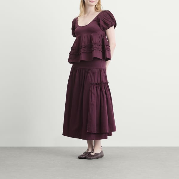 В основе юбки-миди Berta от Damson Madder лежит игривая женственность. Сшитая из дышащего хлопка, она создана для комфорта и отличается легкостью и воздушностью. Вставки с оборками по бокам добавляют движения и дополнительного объема, придавая силуэту игривую и привлекательную форму.