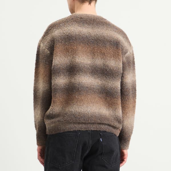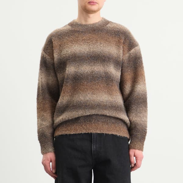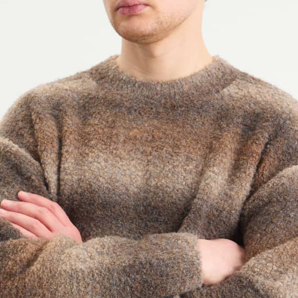 FrizmWORKS выводит текстуру и оттенки на первый план в этом уютном трикотаже, созданном из градиентной букле-пряжи, плавно переходящей по всей поверхности ткани. Уникальная конструкция обеспечивает приятные тактильные ощущения, отличая его от стандартных трикотажных изделий. Полусвободный силуэт сочетает в себе легкость и изысканность, воплощая фирменное сочетание практичности и культурных нюансов бренда.