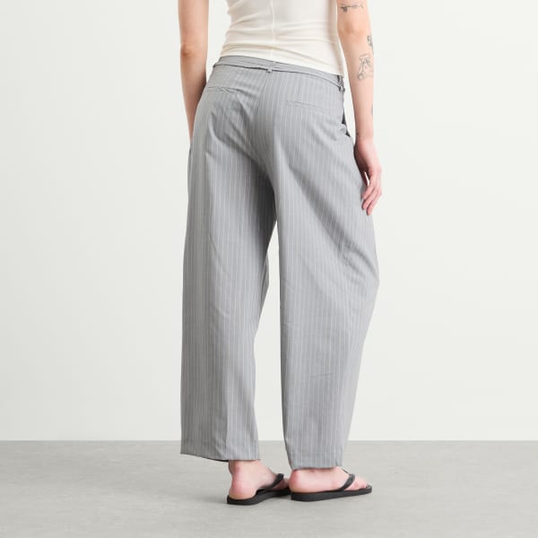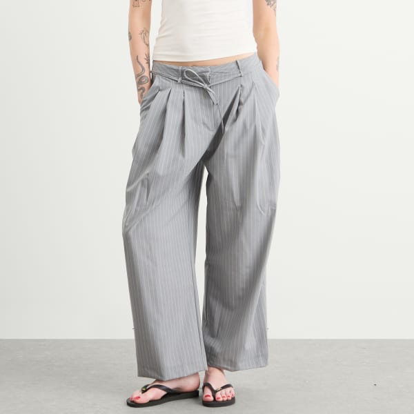 Брюки Deiji Studios с тремя складками сочетают в себе вневременной узор в тонкую полоску и свободный силуэт. Изготовленные из шерсти RWS, они имеют широкий пояс, потайную молнию, пояс-завязку и мягкие складки. Глубокие боковые и задние прорезные карманы добавляют функциональности, а прямой крой штанин по всей длине обеспечивает свободу движений.