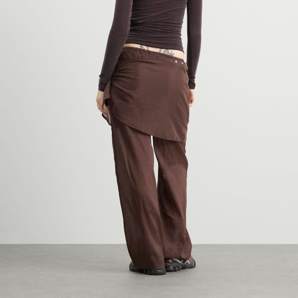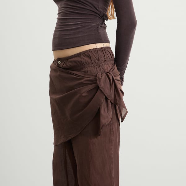 Входящие в капсульную коллекцию END. x Damson Madder «Cocktail Gorpcore», брюки-саронг Paula - это воплощение свободы стиля. Прозрачные и легкие, с прямым кроем и пуговицами из искусственной ракушки, они дополнены съемным саронгом, который можно обернуть, накинуть или даже носить как платок на голову - отсылка к сочетанию элегантности и практичности в коллекции. Вышивка DM добавляет изюминку этому универсальному изделию, идеально подходящему для отдыха.
