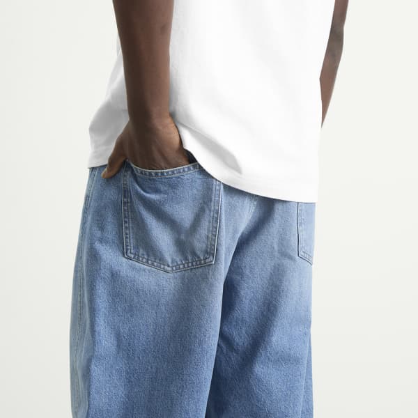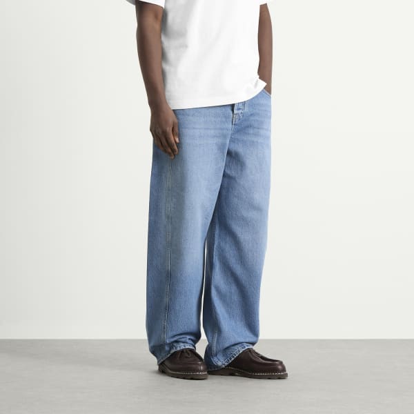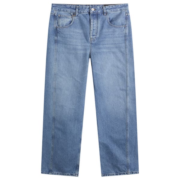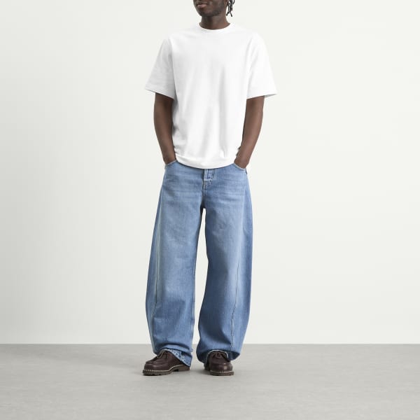 Jacquemus подходит к джинсовой ткани так же, как и ко всему остальному - с игривыми пропорциями, средиземноморской непринужденностью и тихим, но бунтарским чувством минимализма. Эти джинсы с широкими закругленными штанинами и высокой талией сшиты из выстиранной джинсовой ткани цвета индиго, с вытачками на бедрах для дополнительного объема.