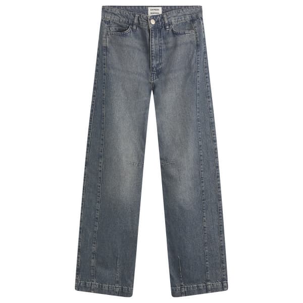 Джинсы Felix от Damson Madder приобретают игривый вид. Свободный крой штанин задает тон, а вытачки на коленях подчеркивают форму, в то время как вышитые красные цветы на задних карманах добавляют индивидуальности под инициалами бренда.