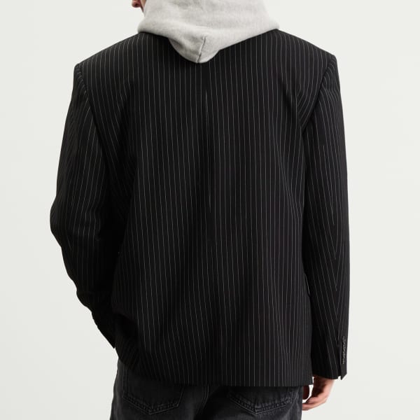 Блейзер в тонкую полоску переосмысливает традиционный крой в модернистском ключе Acne Studios, с удлиненными линиями и свободной драпировкой, которые разрушают жесткость классических костюмов. Его тонкий полосатый узор отсылает к традициям мужской одежды, но общий силуэт остается безошибочно узнаваемым как Acne - чистым, стильным и немного нетрадиционным.