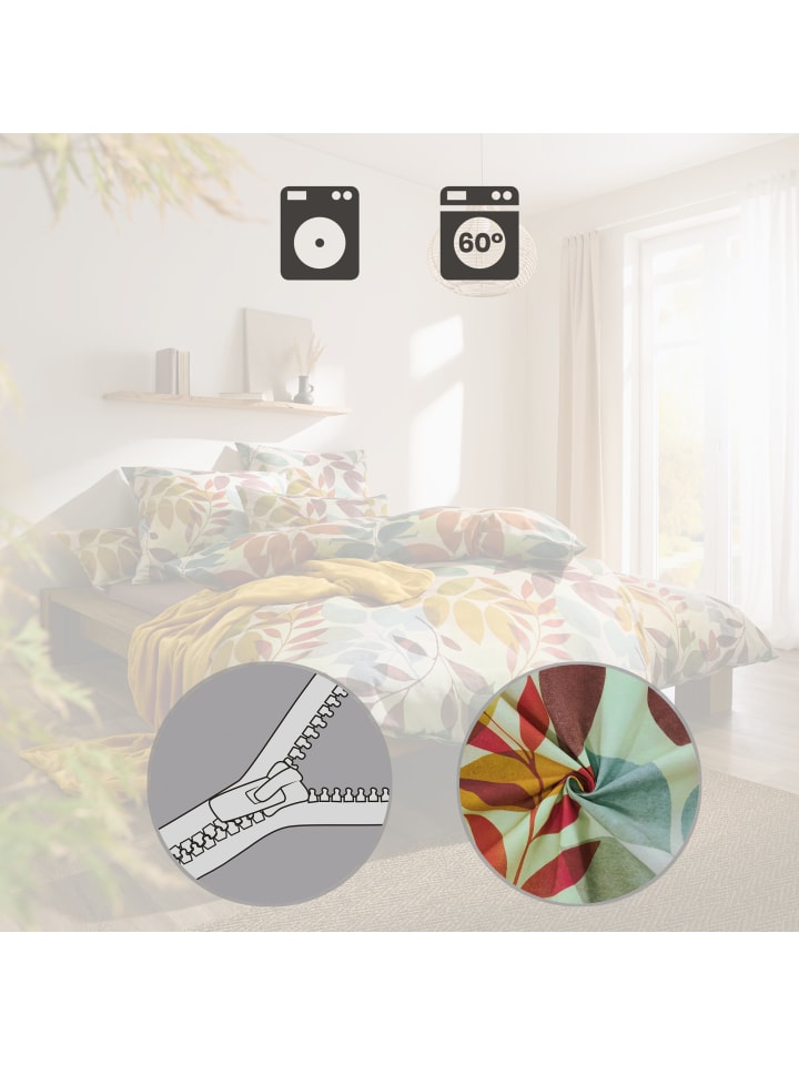 Постельное белье REDBEST из перкаля. Разноцветные листья создают естественную, очаровательную атмосферу в вашей спальне. Благодаря высококачественной цифровой печати цвета выглядят особенно красиво и ярко на гладкой ткани. Эта терморегулирующая ткань не только приятна для кожи и воздухопроницаема, но и исключительно долговечна. Легко надевается благодаря практичной молнии.