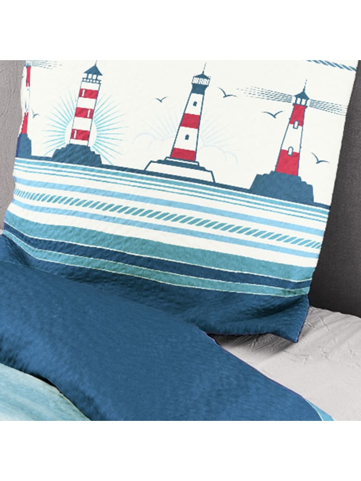 Постельное белье Bierbaum из жатой ткани. Любите побережье? С маяками и полосками это постельное белье привнесет морской шарм в вашу спальню. Легкая, воздушная и нежная ткань сделает ваш сон незабываемым. Прочный эффект мятой ткани обеспечивает оптимальную циркуляцию воздуха; она регулирует температуру, воздухопроницаема и приятна для кожи. Вы быстро оцените простоту ухода за этой тканью, так как она не мнется и легко надевается благодаря молнии.