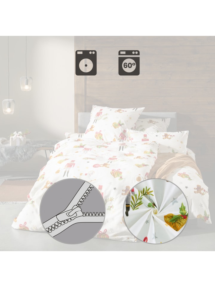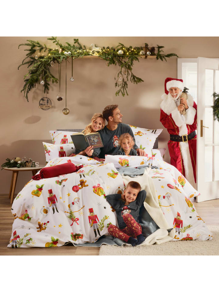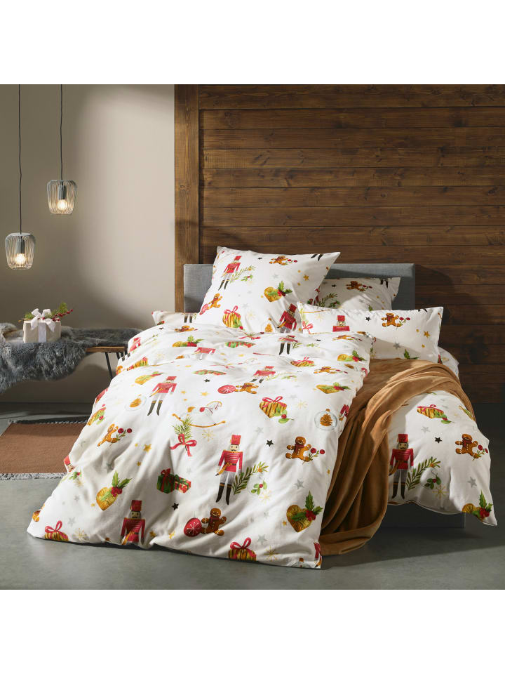 Постельное белье из высококачественной фланели Erwin Müller. Детально проработанные мотивы, такие как щелкунчики, пряничные человечки и подарки, привнесут волшебство Рождества в вашу спальню. Мягкая, ворсистая и эластичная ткань из тонких чесаных нитей - настоящее наслаждение. Она исключительно комфортна и окутывает вас теплом и уютом в холодные зимние месяцы. Это высококачественное льняное полотно не только дышащее и нежное для кожи, но и регулирует температуру, а также просто в уходе. Легко надевается благодаря практичной молнии.