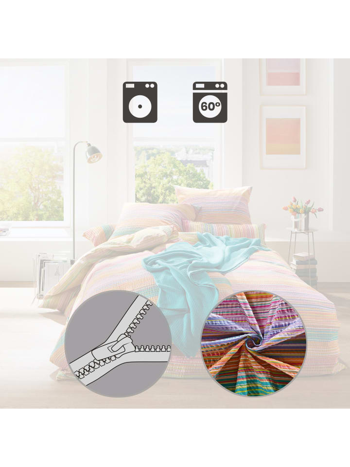 Постельное белье Erwin Müller из ткани сирсакер. Красочные горизонтальные полосы придают вашей спальне современный вид. Эта воздушная, легкая, приятная на ощупь и терморегулирующая ткань станет настоящим удовольствием в теплые летние ночи. Ее постоянная мятая структура обеспечивает оптимальную циркуляцию воздуха и превосходное регулирование влажности. Вы быстро оцените его простоту в уходе: это простое в использовании постельное белье практически не мнется - просто постирайте, высушите, и благодаря молнии быстро застегните его обратно на кровать.