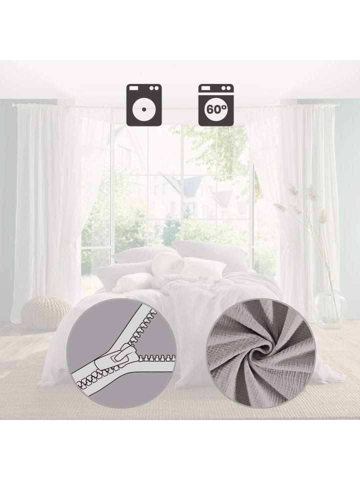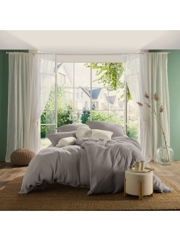 Муслиновое постельное белье Erwin Müller "Himmelkron". Предпочитаете минималистичный стиль? Тогда вам понравится это однотонное постельное белье, которое легко впишется в любой интерьер. Муслин изготовлен с использованием специальной техники плетения, при которой нити свободно переплетаются. Это создает его приятную на ощупь мягкость и воздушность. Современная мятая текстура создана специально, чтобы выглядеть слегка негладкой. Эта текстура позволяет ткани мягко облегать кожу, обеспечивая циркуляцию воздуха. Муслин также обладает высокой воздухопроницаемостью, быстро отводит влагу и обеспечивает приятную сухость во время сна, даже в теплые летние ночи. Это уютное постельное белье - отличный выбор как для лета, так и для зимы; оно приятно для кожи, не мнется и долговечно. Легко менять благодаря застежке-молнии. Из-за материала это постельное белье может быть немного большемерным. Характерный мягкий мятый эффект полностью проявится после первой стирки. Характеристики товара: - Серия Himmelkron - Однотонный дизайн - Качество: муслин - С фирменной молнией - Не требует глажки - Материал: 100% хлопок (BW) - Инструкции по стирке: - Стирать при 60°C - Не отбеливать - Сушить в сушилке при низкой температуре - Не гладить - Не подвергать химчистке - Серия Himmelkron - Однотонный дизайн - С фирменной молнией - Не требует глажки - Материал: 100% хлопок - Стирать при 60°C, сушить в сушилке при низкой температуре, не гладить - Материал: 100% хлопок