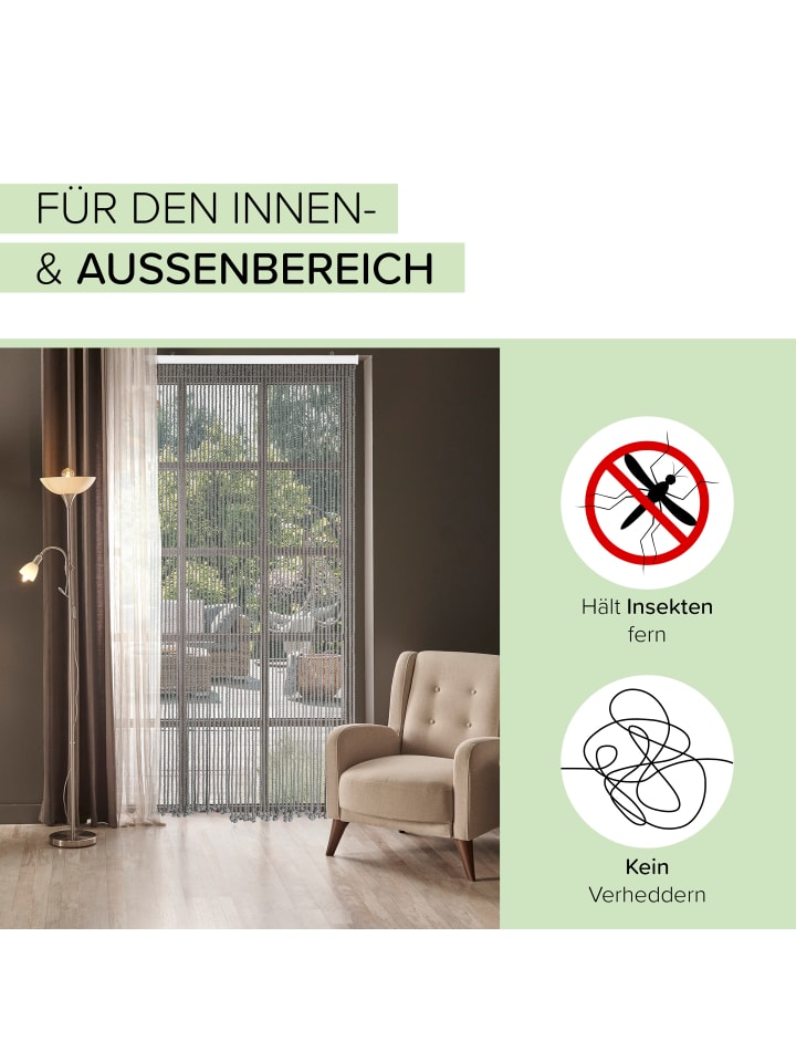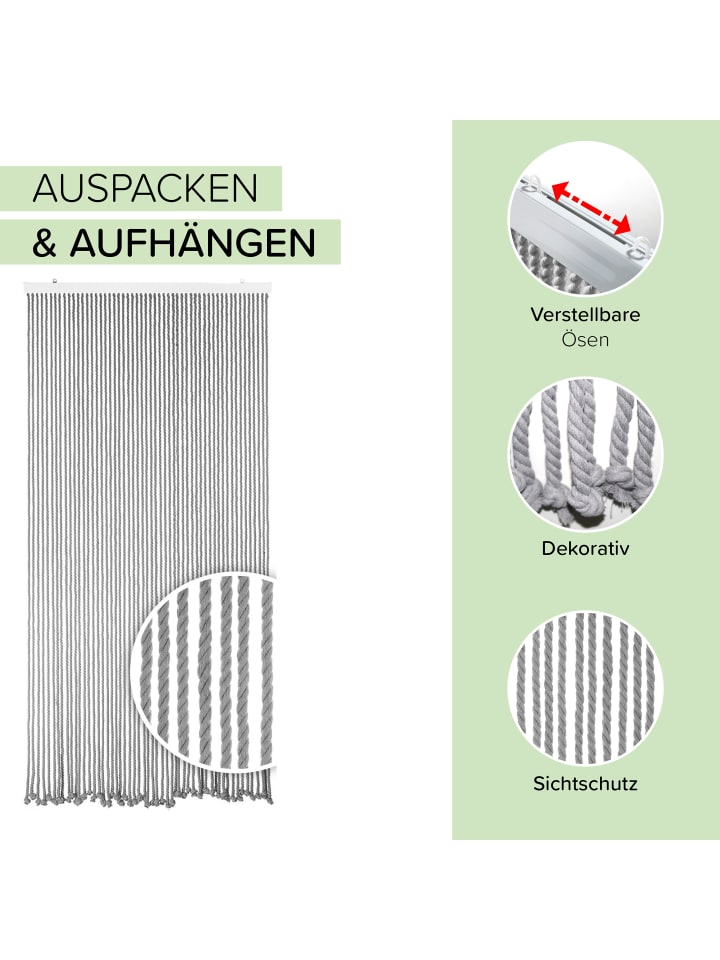 Красивая серая хлопковая веревочная штора от Kobolo. Проверенное временем средство от насекомых с дополнительным декоративным эффектом. Привлекает внимание на любой двери и обеспечивает надежную защиту от большинства насекомых благодаря диаметру веревки 8-10 мм. Длина отдельных нитей варьируется - приблизительно 185-195 см. Материал: 85% хлопок, 10% дерево, 5% металл.