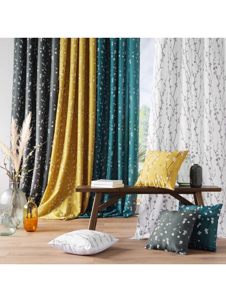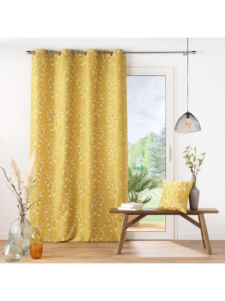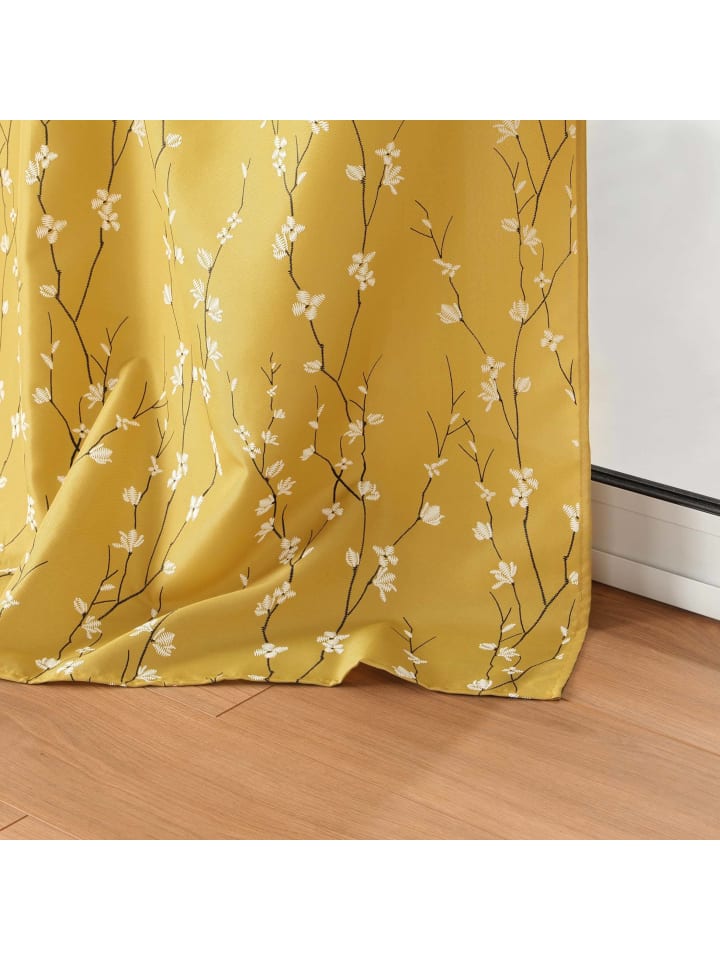 Желтые шторы на люверсах - узор «Цветущая вишня» и приглушенные цвета. Шторы SAKURA горчичного цвета: Изделие изготовлено из полиэстера плотностью 150 г/м². Ткань достаточно плотная, но при этом легкая, что позволяет создавать складки. Узор «Вишневые веточки»: Шторы украшены нежным узором в виде цветущей вишни, что придает им особое очарование. Крепление на люверсах: Это облегчает подвешивание штор на карниз. Стандартный размер штор: Ширина штор составляет 140 см, а длина - 280 см, что делает их идеальными для большинства окон. Коллекция SAKURA: В нашем ассортименте вы также найдете декоративные подушки SAKURA тех же цветов и с мотивом цветущей вишни, которые идеально дополняют шторы.