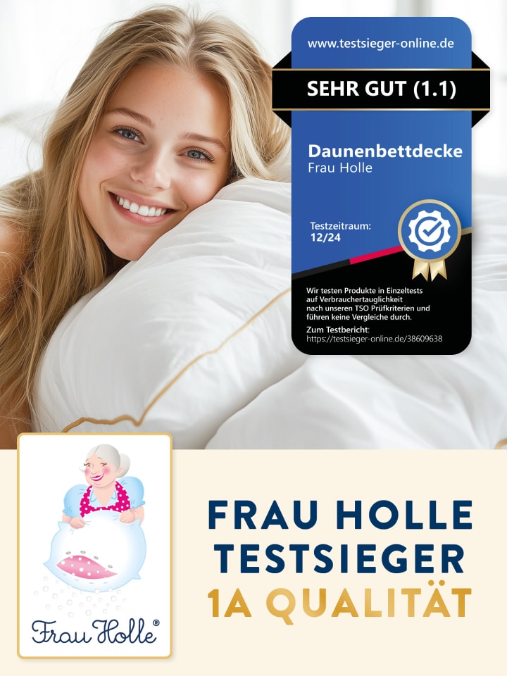 Ощутите максимальный комфорт во время сна с пуховыми одеялами Frau Holle PRESTIGE, наполненными 100% новым белым немецким пухом, сертифицированным DOWNPASS как полученный из гуманных условий содержания животных и гарантированно не подвергавшийся выщипыванию живых особей. Элегантный чехол из тончайшего немецкого батиста Mako обеспечивает несравненно мягкое ощущение на коже. Изысканная золотая окантовка завершает роскошный дизайн. Благодаря сертификации Oeko-Tex, чехлы для одеял протестированы на наличие вредных веществ, а сертифицированная плотная ткань не содержит домашней пыли и клещей. Каждое одеяло изготавливается вручную в Германии, поштучно, для здорового и комфортного сна. Выберите идеальное одеяло: летнее «ЛЕГКОЕ», всесезонное «СРЕДНЕЕ» или зимнее «ТЕПЛОЕ».