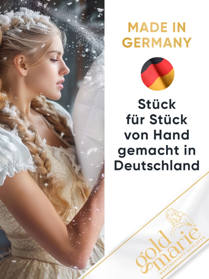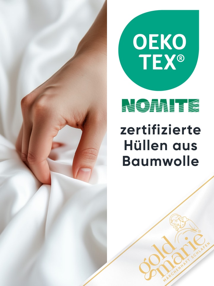 Невероятно легкое, райски мягкое и идеально подходящее для теплых ночей: летнее одеяло "MARIE" обеспечивает воздушный и легкий сон благодаря чистому пуху класса 1. Высокая воздухопроницаемость и низкое теплопоглощение гарантируют приятную сухость во время сна, не создавая ощущения тяжести. Особенно впечатляет: всего 300 г лучшего пуха обеспечивают исключительный объем односпальному размеру (135 × 200 см). Созданное с тщательным вниманием к деталям, одеяло GOLDMARIE олицетворяет высочайшее немецкое качество и подлинное мастерство. Каждое одеяло тщательно изготавливается вручную - это настоящий продукт "Сделано в Германии". Наполнитель, сертифицированный DOWNPASS, гарантирует, что используемый пух получен из гуманных условий содержания животных без ощипывания заживо. Тонкий чехол из 100% сатина с пухом мако невероятно мягкий на ощупь и не пропускает пух. Кроме того, плотно сплетенная ткань защищает от пылевых клещей, обеспечивая гигиеничный и беззаботный сон. Естественно, все материалы прошли проверку на наличие вредных веществ и имеют сертификат Oeko-Tex.