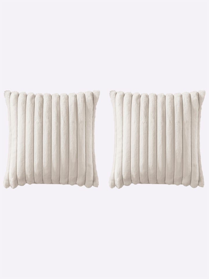 Плотная клетчатая ткань. Лицевая сторона из искусственного меха с полосатой текстурой, обратная сторона из бархата. Наволочка на молнии.