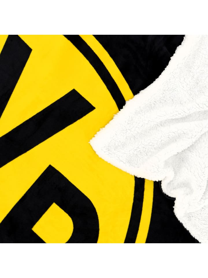 Укутайтесь в черное одеяло BVB! Это высококачественное одеяло из шерпы сочетает в себе комфорт и гордость за клуб. Лицевая сторона, выполненная из мягкого черного фланелевого флиса (220 г/м²), украшена культовым желтым логотипом BVB, а обратная сторона, изготовленная из приятного на ощупь шерпы кремового цвета (200 г/м²), обеспечивает уютное тепло. Этот плед размером 150 x 200 см идеально подходит для расслабляющих вечеров на диване.