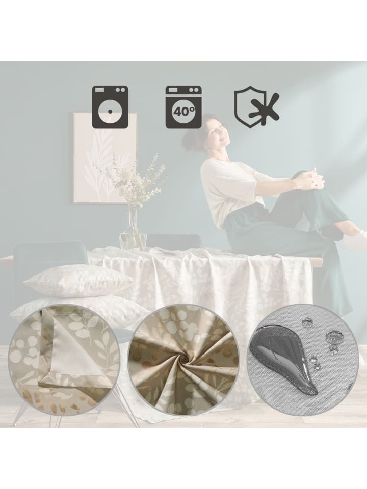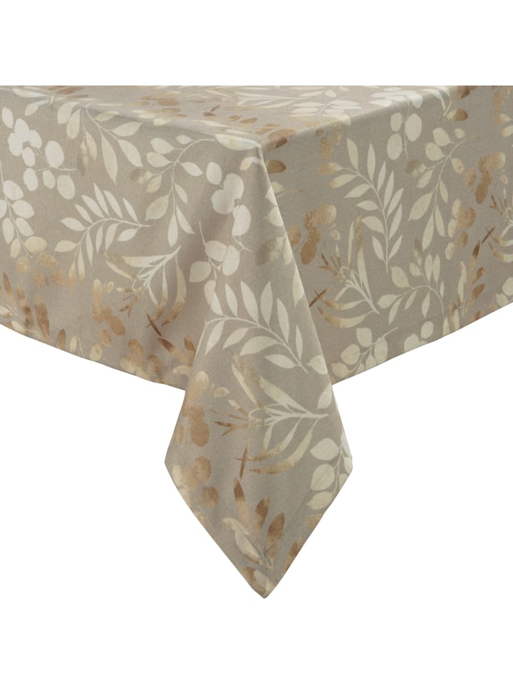 Скатерть Erwin Müller «Листья» с защитой от пятен. Декоративный узор в виде листьев придаст вашей гостиной и столовой естественный шарм. Благодаря высококачественной цифровой печати рисунок выглядит особенно ярко. Эта серия, не требующая особого ухода, изготовлена из прочного холста, мягкого и приятного на ощупь материала. Встроенная защита от пятен значительно упрощает чистку.