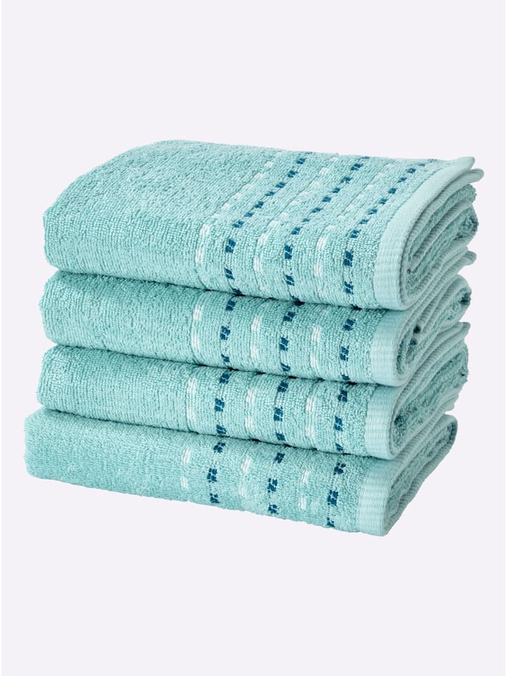 Ваш кошелек скажет вам спасибо: набор из 4 полотенец с красивой разноцветной каймой, украшенной ткаными графическими элементами. Салфетки без каймы. Мягкая махровая ткань, 400 г/м².