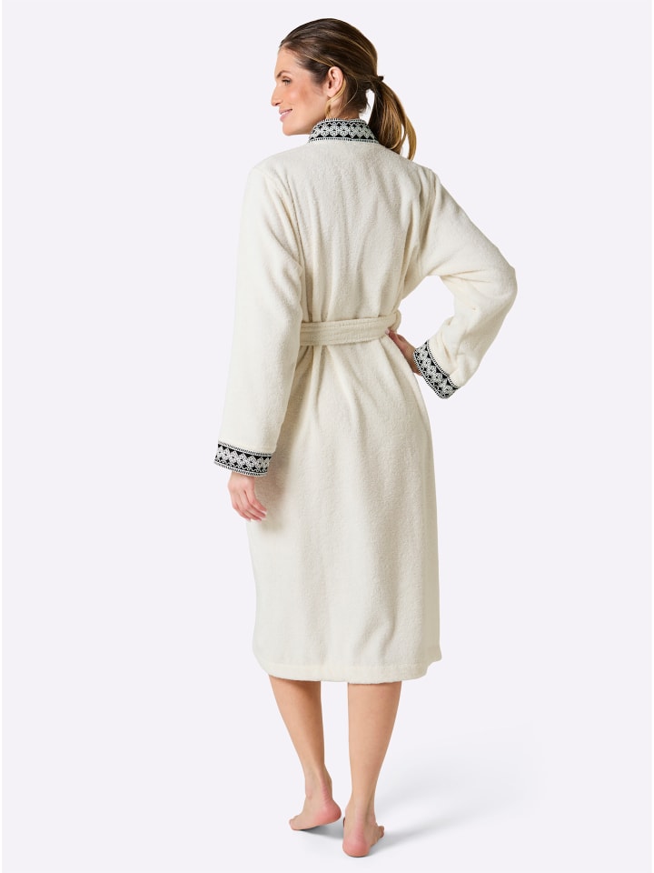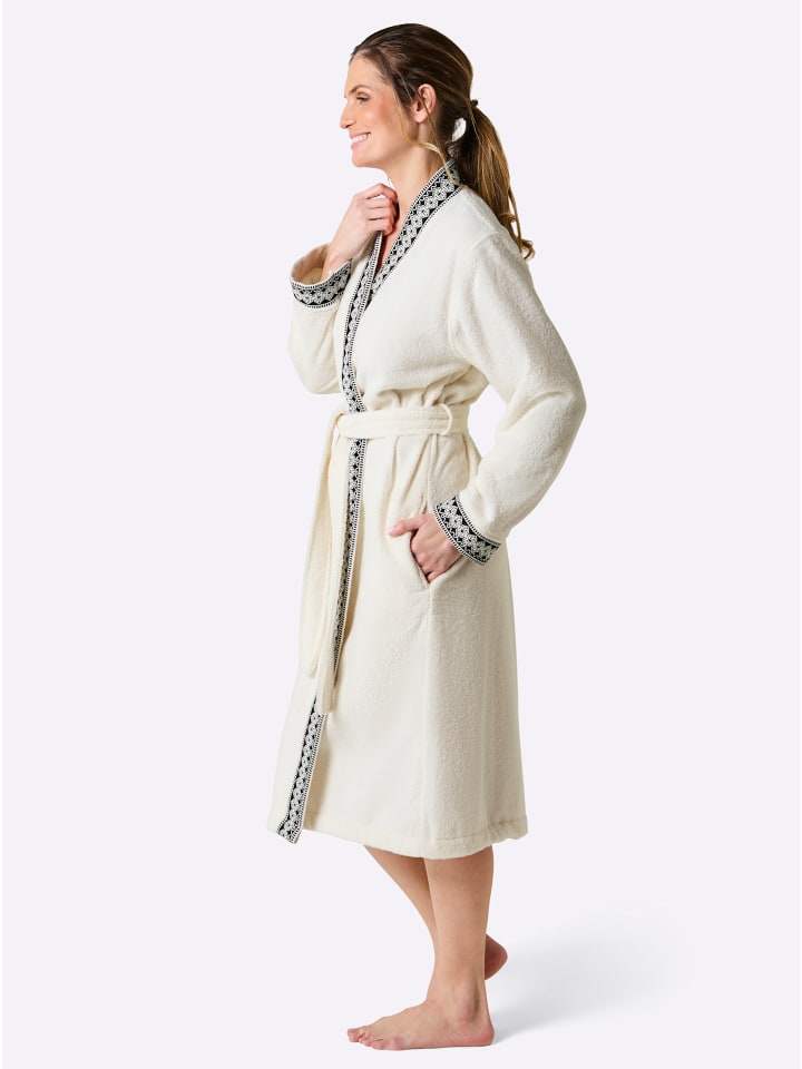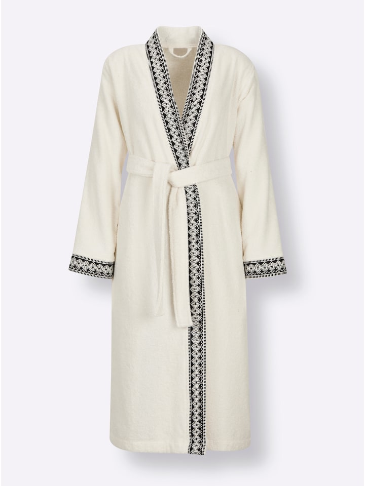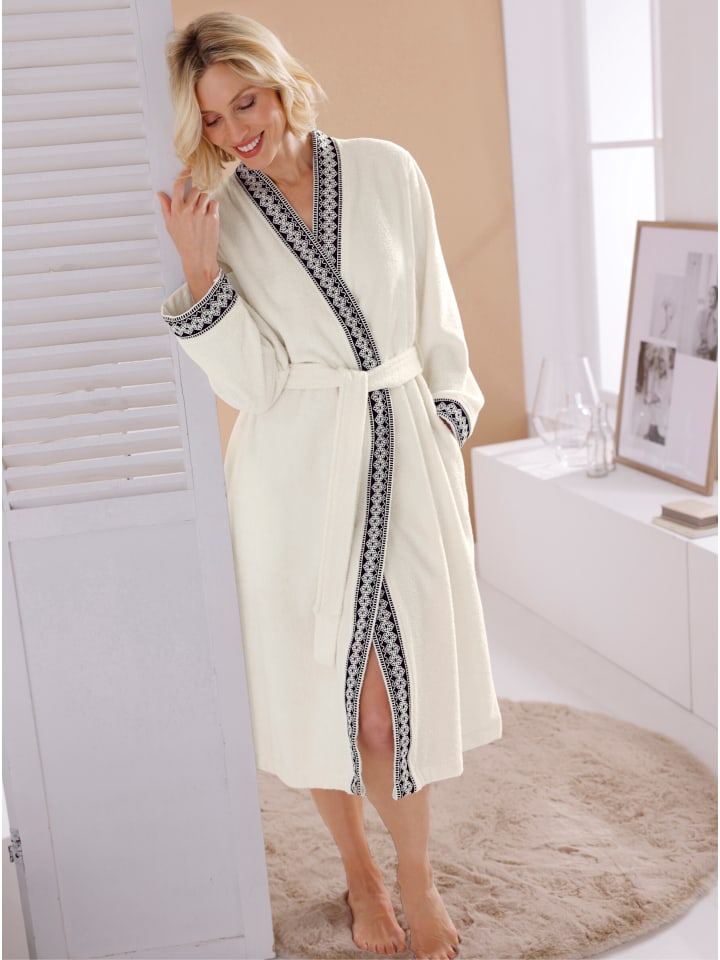 Уютный банный халат от Plantier из впитывающей махровой ткани. С декоративной тканой отделкой по краю и на концах длинных рукавов. Два боковых кармана. С поясом и петлями для ремня.