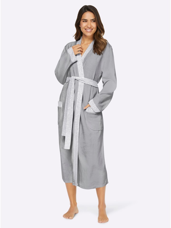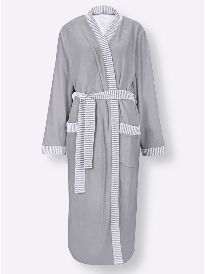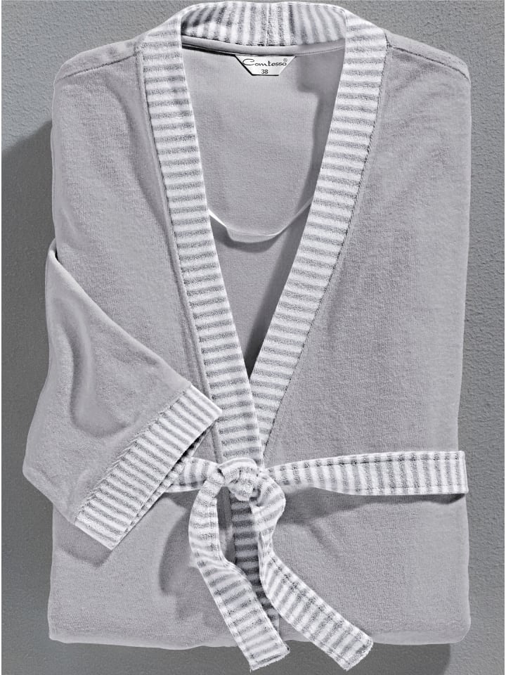 Халат Comtessa из мягкой, легкой махровой ткани. Классический стиль кимоно. Воротник, пояс и клапаны карманов в полоску. С петлями для ремня.