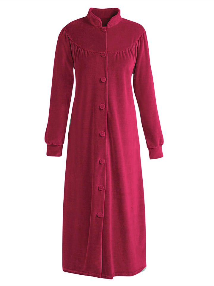 Велюровый халат из мягкой, пушистой ткани с воротником-стойкой и круглой кокеткой. Застежка на пуговицы по всей длине. Два кармана. Рукава с манжетами.