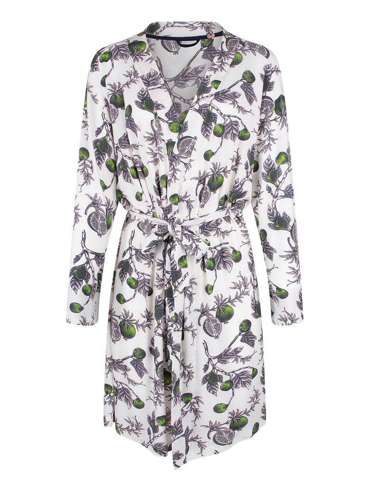 Это элегантное женское кимоно от SHORT STORIES изготовлено из мягкой модальной смеси и красиво драпируется. Идеально подходит для ношения поверх ночной одежды, длина выше колена, застегивается на талии поясом. Слегка расклешенные рукава добавляют воздушности и женственности. Яркий принт спелых зеленых инжиров на ветках на белом фоне привнесет свежесть в ваш гардероб. Идеально подходит для расслабленного утра.