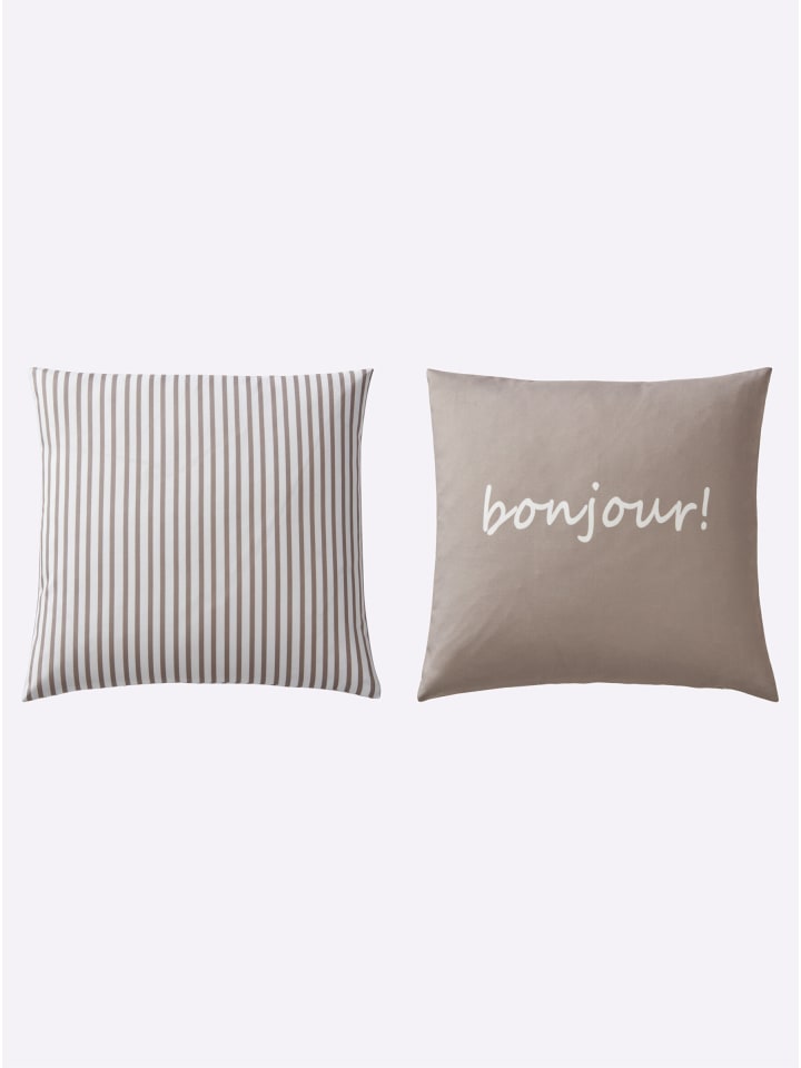 Комплект из 2 наволочек. Слегка глянцевая ткань, имитирующая холст, с цифровой печатью. Одна с полосатым рисунком, другая со словом «BONJOUR». С застежкой-молнией.