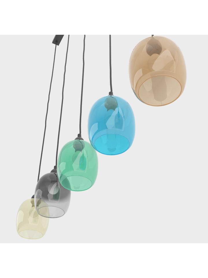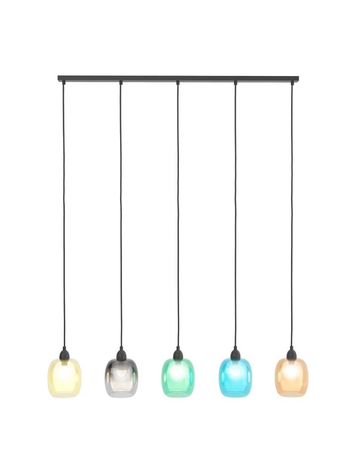 Этот подвесной светильник с пятью плафонами и разноцветными стеклянными абажурами обеспечивает широкое и яркое распределение света в ваших комнатах. Стеклянные абажуры установлены на прочной металлической планке с порошковым покрытием, что гарантирует долговечность. Благодаря своей ширине он идеально подходит для освещения длинных обеденных столов. Декоративный элемент, привлекающий внимание в современных и ярких концепциях дизайна интерьера. - Подвесной светильник с пятью плафонами для широкого и яркого распределения света. - Разноцветные стеклянные абажуры на прочном железном каркасе. - Высококачественная металлическая планка с порошковым покрытием. - Размеры: 109,0 x 150,0 x 15,0 см. - Идеальный источник света для длинных обеденных столов или кухонных столешниц.