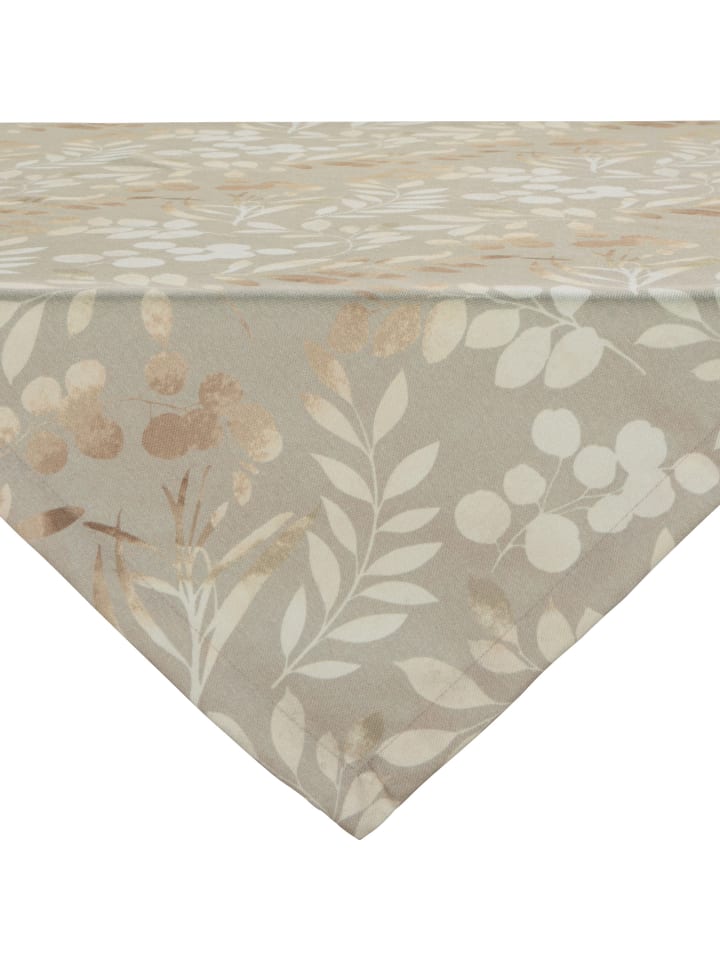 Скатерть-дорожка Erwin Müller «Листья» с защитой от пятен. Декоративный узор в виде листьев придаст вашей гостиной и столовой естественный шарм. Благодаря высококачественной цифровой печати рисунок выглядит особенно ярко. Эта серия, не требующая особого ухода, изготовлена из прочного холста, приятного на ощупь и эластичного. Встроенная защита от пятен значительно упрощает чистку.