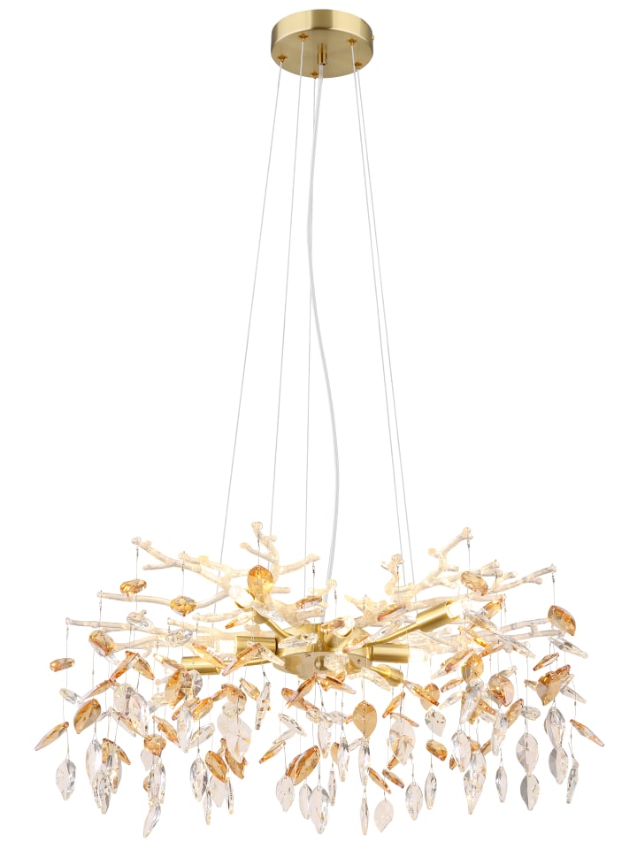Металлическая люстра, матовое золотистое покрытие, янтарные и прозрачные хрустальные кристаллы, регулируемая высота, диаметр: 610 мм, высота: 1200 мм, в комплект не входят 8 лампочек G9 8 Вт 230 В.