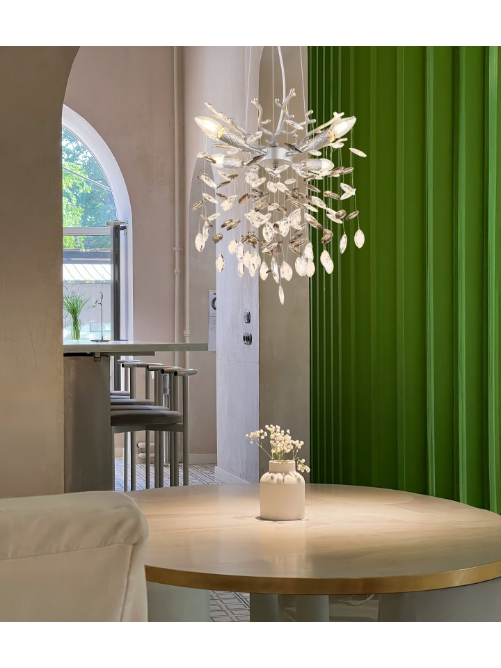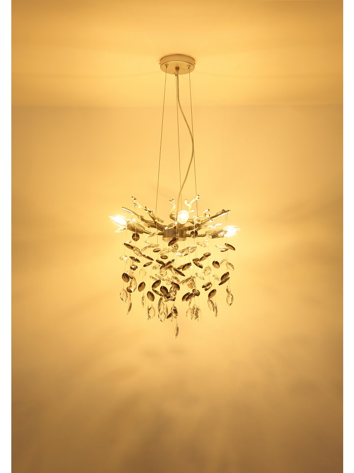 Люстра из матового металла серебристого цвета, хрустальные подвески из прозрачного дымчатого стекла, регулируемая высота, гибкие патроны, диаметр: 400 мм, высота: 1200 мм, без учета 4 ламп E14 40 Вт 230 В.