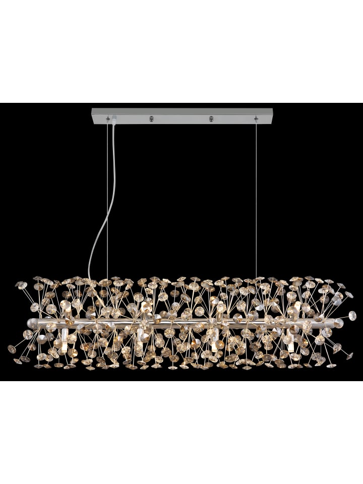 Хромированная металлическая люстра, хрустальные подвески K9 дымчатого цвета, прозрачный ПВХ-кабель, регулируемая высота, размеры (Д x Ш x В): 900 x 300 x 1500 мм, в комплекте 12 светодиодных ламп G9 3,5 Вт 230 В, световой поток 350 лм, цветовая температура 3000 К, артикул 10676.