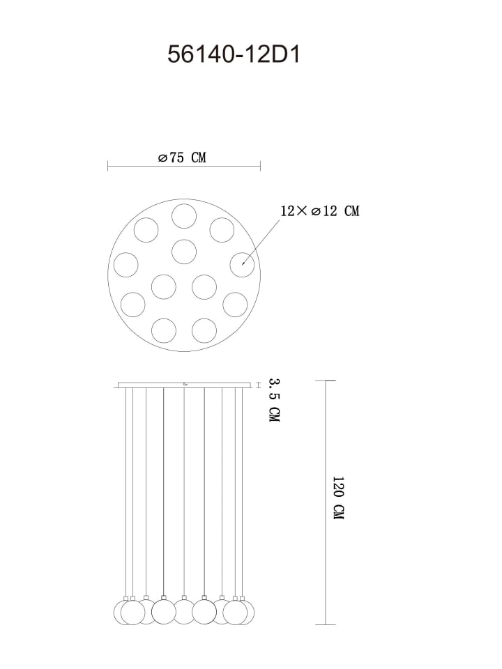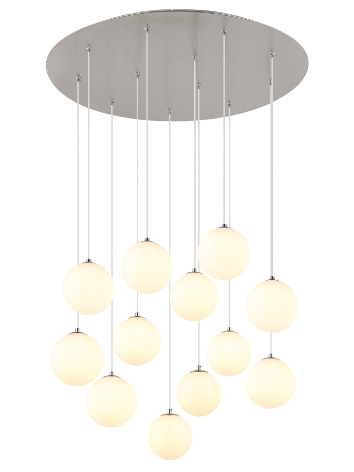 Потолочный светильник, металл, матовая никелированная отделка, плафоны из опалового стекла, черный ПВХ-кабель, регулировка высоты, диаметр: 750 мм, высота: 1200 мм, в комплекте 12 светодиодов G9 3,5 Вт, 230 В, источник света 350 лм, световой поток 310 лм, цветовая температура 3000K.