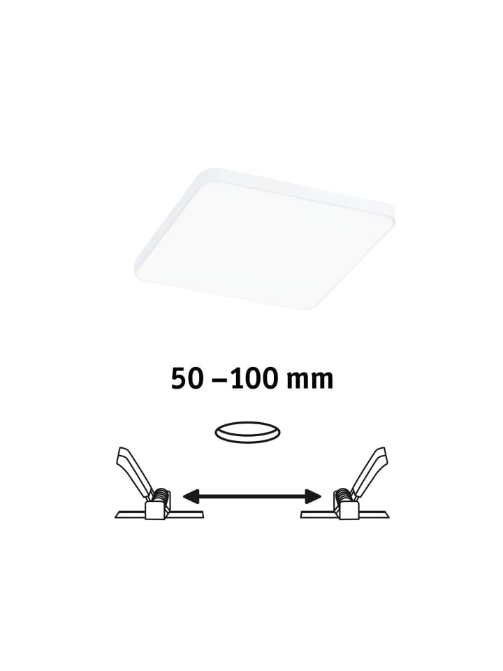Квадратная встраиваемая панель Veluna VariFit Edge впечатляет своим современным безрамочным дизайном в сдержанном белом цвете. Диаметр 90 мм и цветовая температура 4000K обеспечивают высокую и равномерную светоотдачу. Благодаря гибкой технологии VariFit, пружины крепления можно плавно регулировать в диапазоне от 50 до 70 мм. Это позволяет устанавливать панель как в существующие, так и в новые отверстия. Для отверстия диаметром 50 мм требуется глубина полости 35 мм. Пластиковый корпус с сатинированной отделкой создает тонкое рассеивание света и яркий, бодрящий нейтральный белый свет.