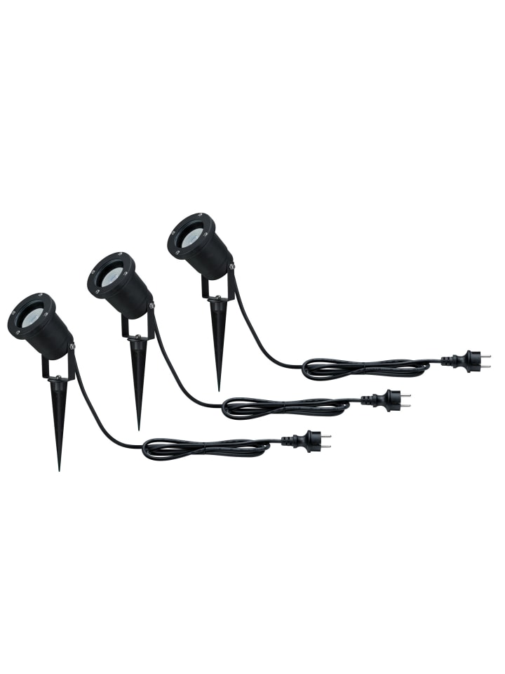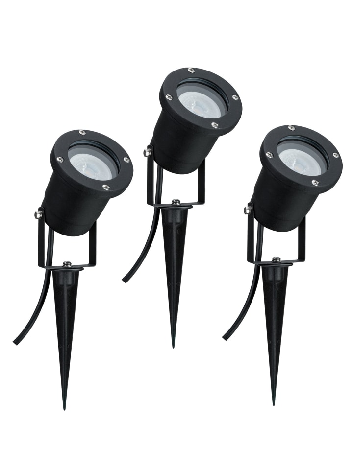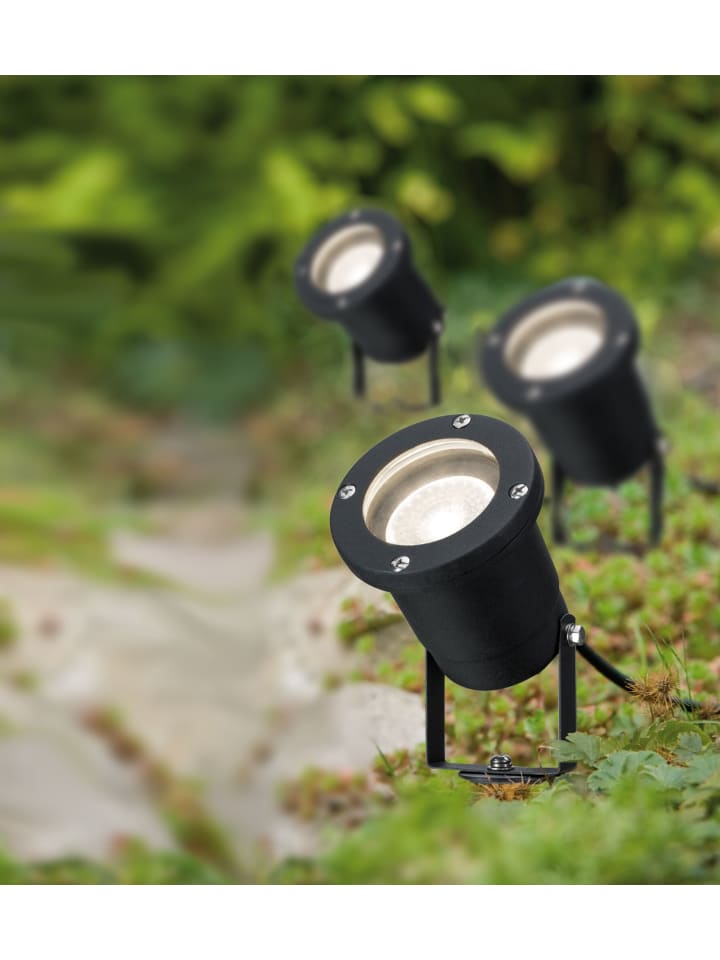 Эти регулируемые садовые прожекторы, продаваемые в комплекте из трех штук, освещают цветы, кустарники и деревья теплым белым светом. Подходящие лампы входят в комплект. При необходимости светильники также можно использовать без заземляющего штыря в качестве наземных прожекторов для освещения фасадов, садовых сараев и террас. Светильники имеют степень защиты от брызг IP65 и могут быть установлены на открытом воздухе. Вилка имеет степень защиты от брызг IP44, поэтому ее следует устанавливать на доме или под крышей. - Степень защиты IP: IP65 - защита от брызг - Комплект из 3 светильников - Лампы в комплекте (сменные) - Цветовая температура: 3000K - Теплый белый - Для прямого подключения к сети 230 В - Не диммируемый - Цвет: черный - Материал: алюминий - Круглый - 230 В - Макс. 3 x 10 Вт - Цоколь: GU10 - Светодиодный - Высота: 320 см - Шнур питания: 200 см