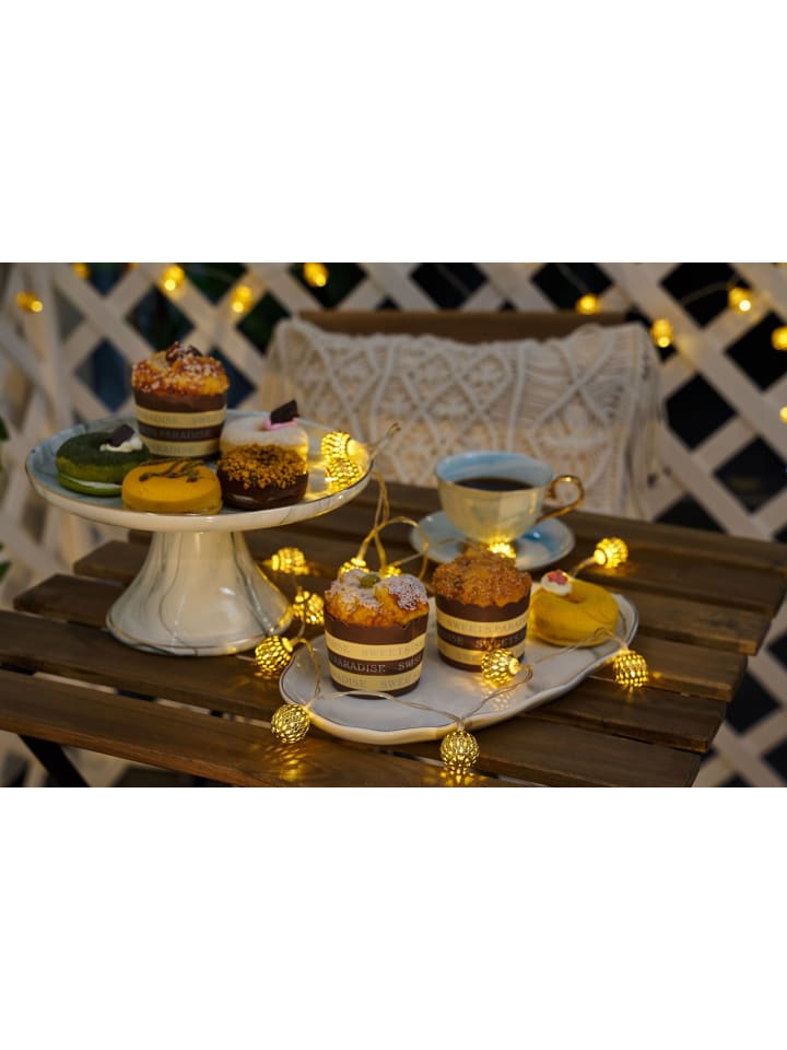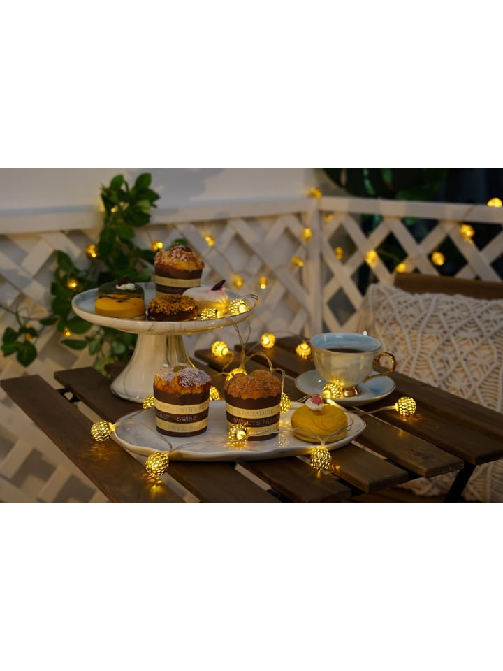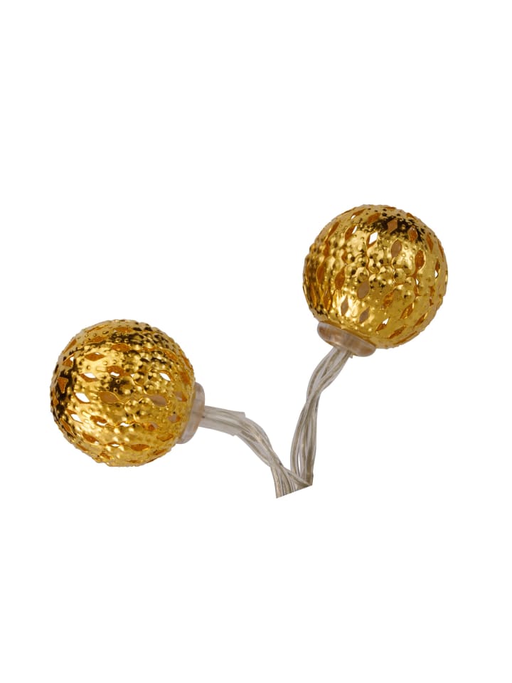 Золотистая гирлянда на солнечных батареях Sunshine Glamour украсит долгие летние ночи декоративным светом благодаря 20 высококачественным светящимся металлическим шарам в восточном стиле! Солнечная панель заряжается от солнечного света в течение дня. Светильники автоматически включаются с наступлением сумерек. Они обеспечивают до 8 часов освещения в день, создавая уютную атмосферу на вашем балконе или в саду. Просто воткните солнечную панель в землю в солнечном месте. Гирлянда особенно красиво смотрится в цветниках, вдоль заборов или на кустах. Вам не нужно беспокоиться о поиске ближайшей розетки, так как светодиодный модуль позволяет гибко размещать гирлянду. Выберите один из двух режимов освещения: постоянное свечение или мигание. Гирлянда на солнечных батареях имеет множество преимуществ: она идеально подходит для балконов или садов, благодаря солнечной технологии ее можно гибко размещать, она имеет сменный аккумулятор и защищена от брызг благодаря степени защиты IP44. - Эффекты освещения в винтажном стиле - Защита от брызг IP44 - Современный теплый светодиодный свет - Автоматическое включение с наступлением сумерек - Идеально подходит для балконов или садов - Солнечный фонарь с батарейкой - До 6 часов освещения - Солнечная гирлянда с батарейкой - Изделие не регулируется по яркости - Цвет: Золотой - Материал: Металл - Сферическая форма - 1,2 В - Светодиоды - Высота: 235 см