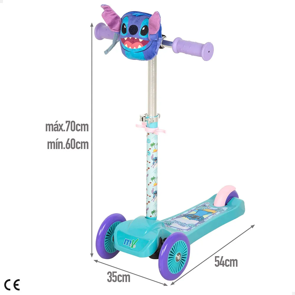 Станьте настоящим героем с трехколесным самокатом «Стич»! Этот официально лицензированный детский самокат Disney размером 35x54x60/70 см выделяется своим дизайном, вдохновленным дружелюбным персонажем, и имеет передний карман с объемными ушками для хранения мелких предметов.