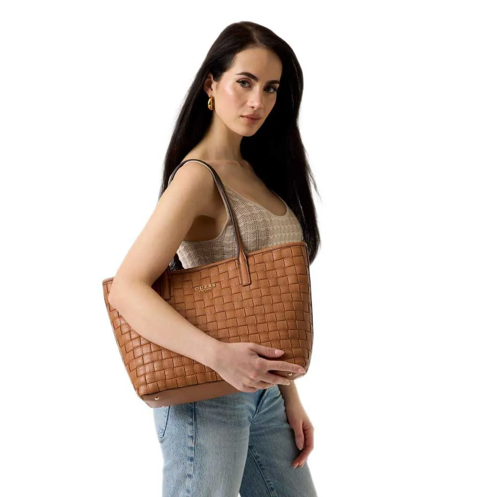 - Внешняя часть из плетеной искусственной кожи. - Застежка-молния. - Фурнитура золотистого цвета. - Подкладка с персонализированным логотипом. - Встроенный карман на молнии.