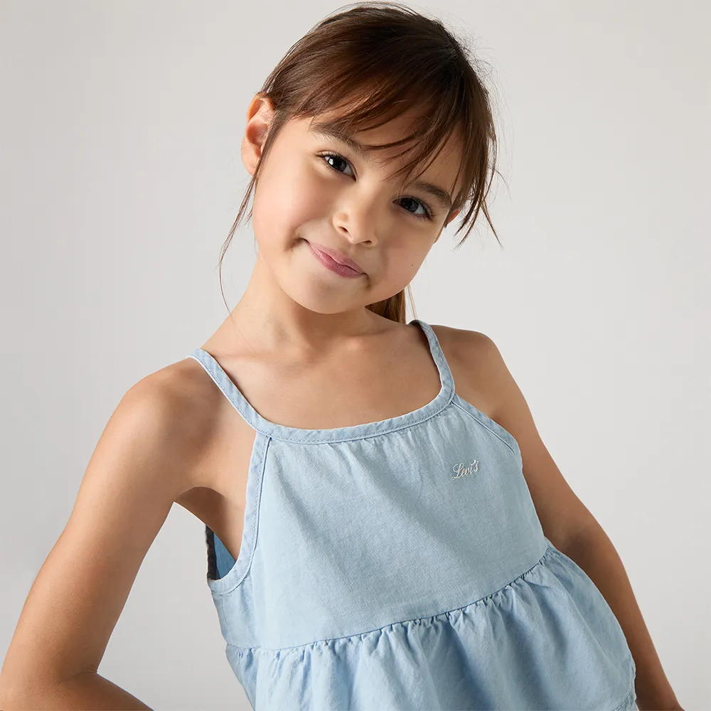 Приготовьтесь к новым приключениям с этим очаровательным комплектом Levi's, включающим в себя многослойную майку и брюки.