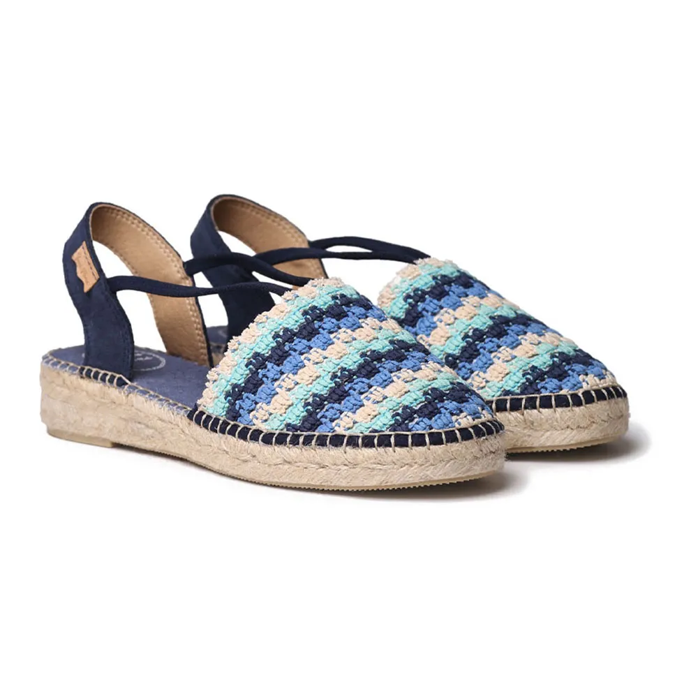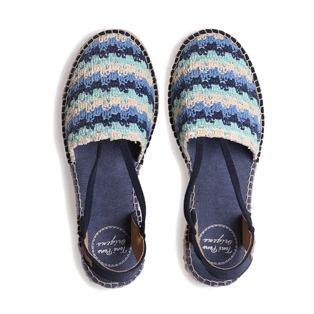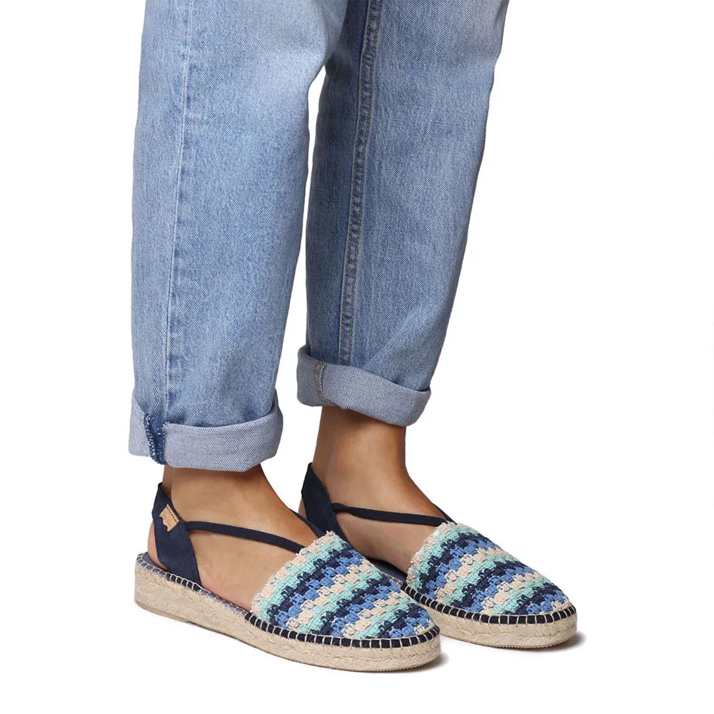 Эти женские эспадрильи на плоской подошве изготовлены из разноцветной ткани, напоминающей вязаный крючком материал.