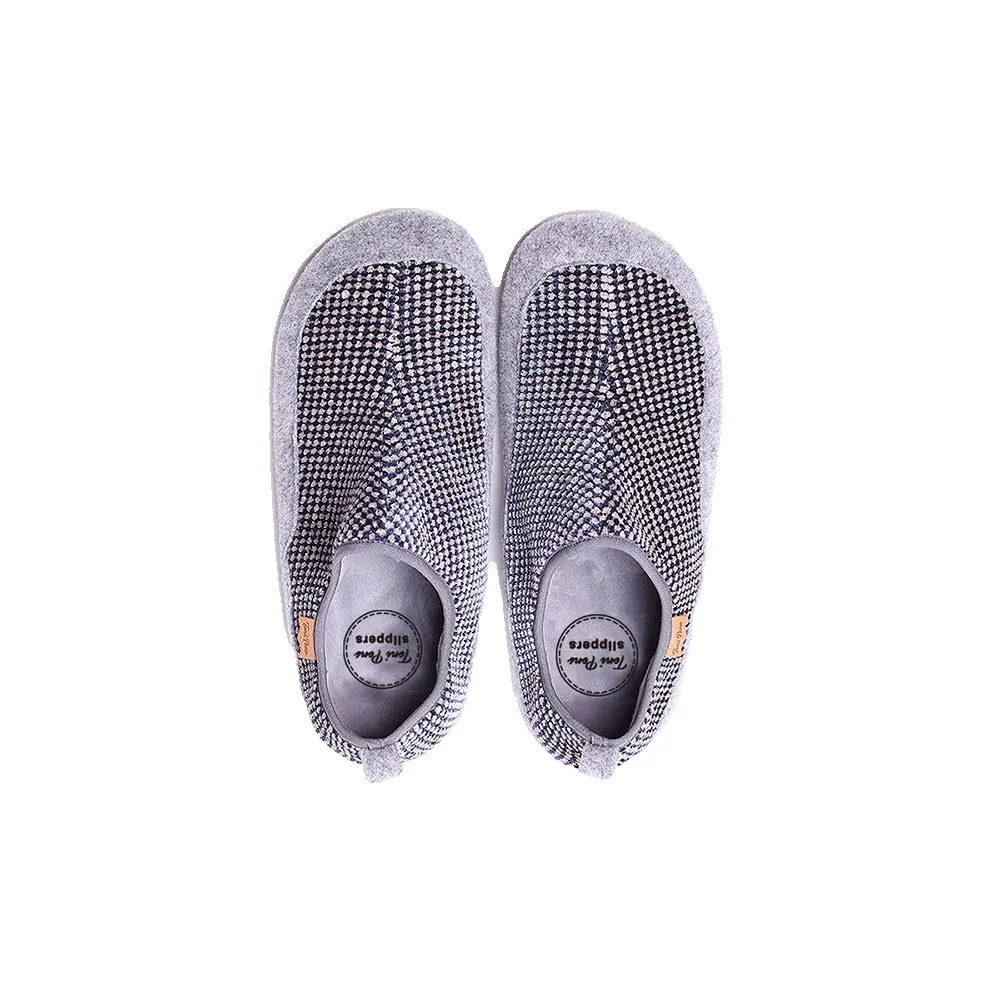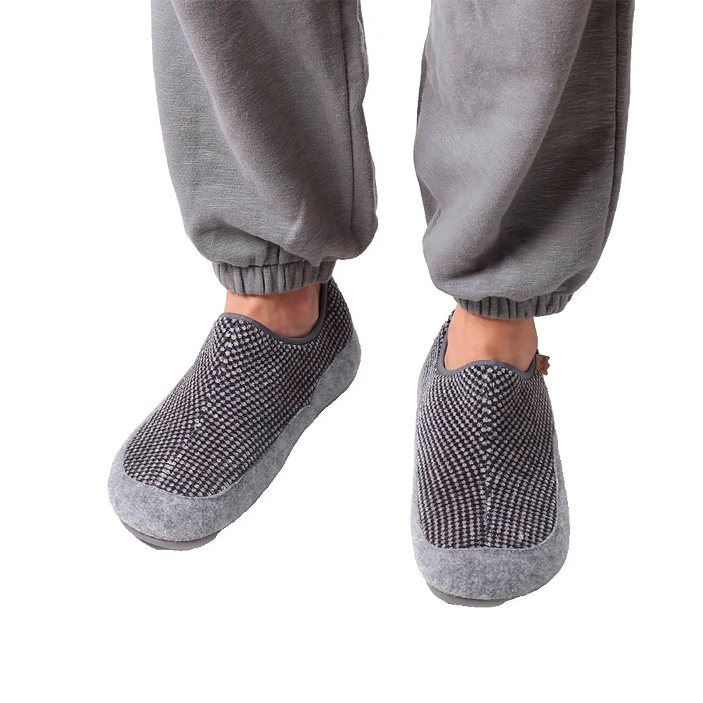 Мужские домашние тапочки из бархатистой ткани в форме маленьких квадратиков, сочетающейся с однотонным войлоком.