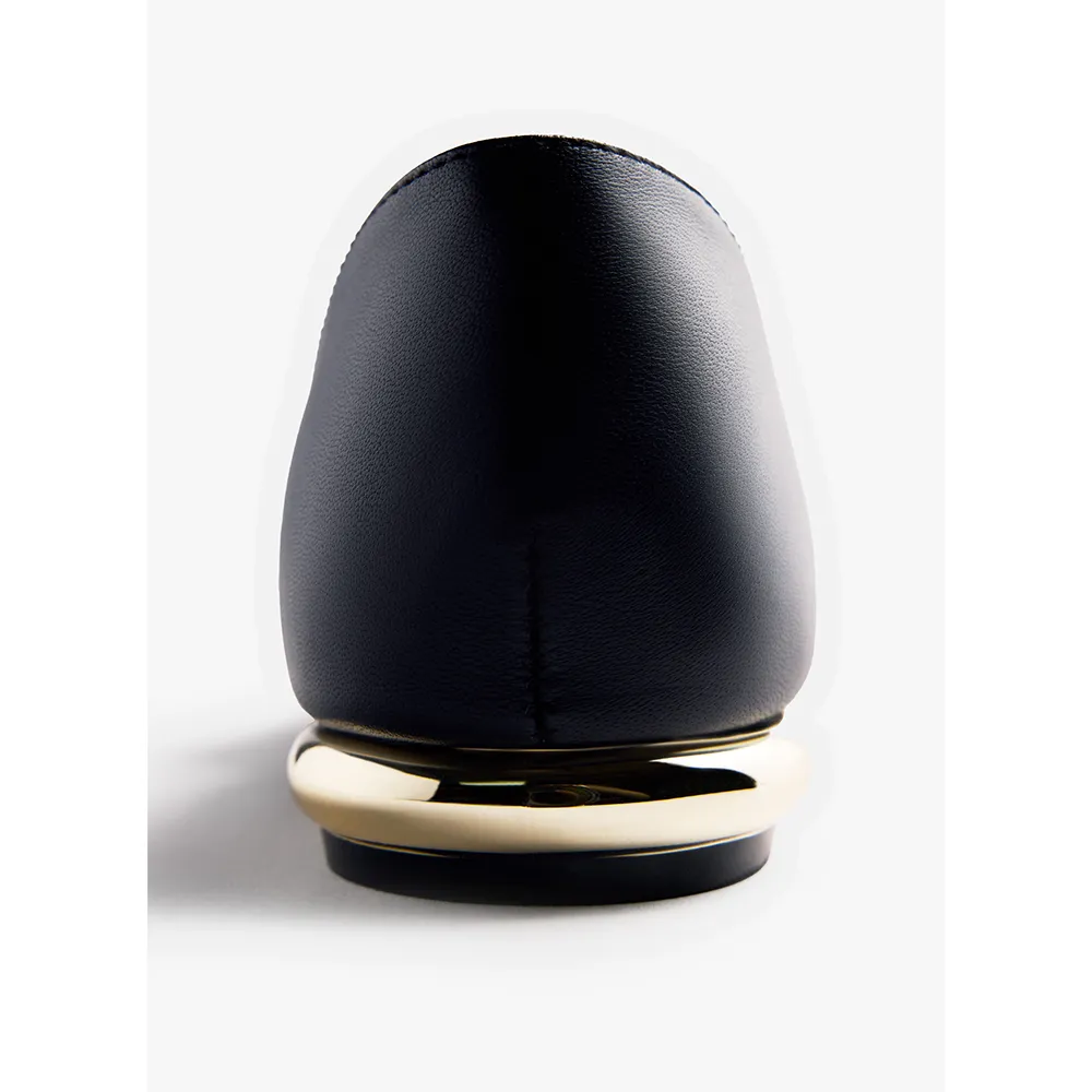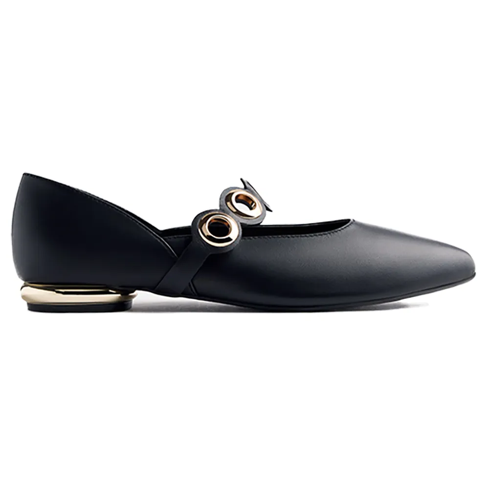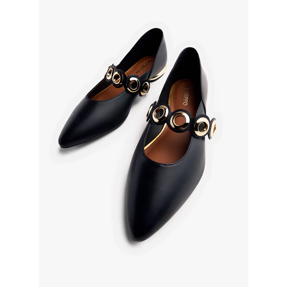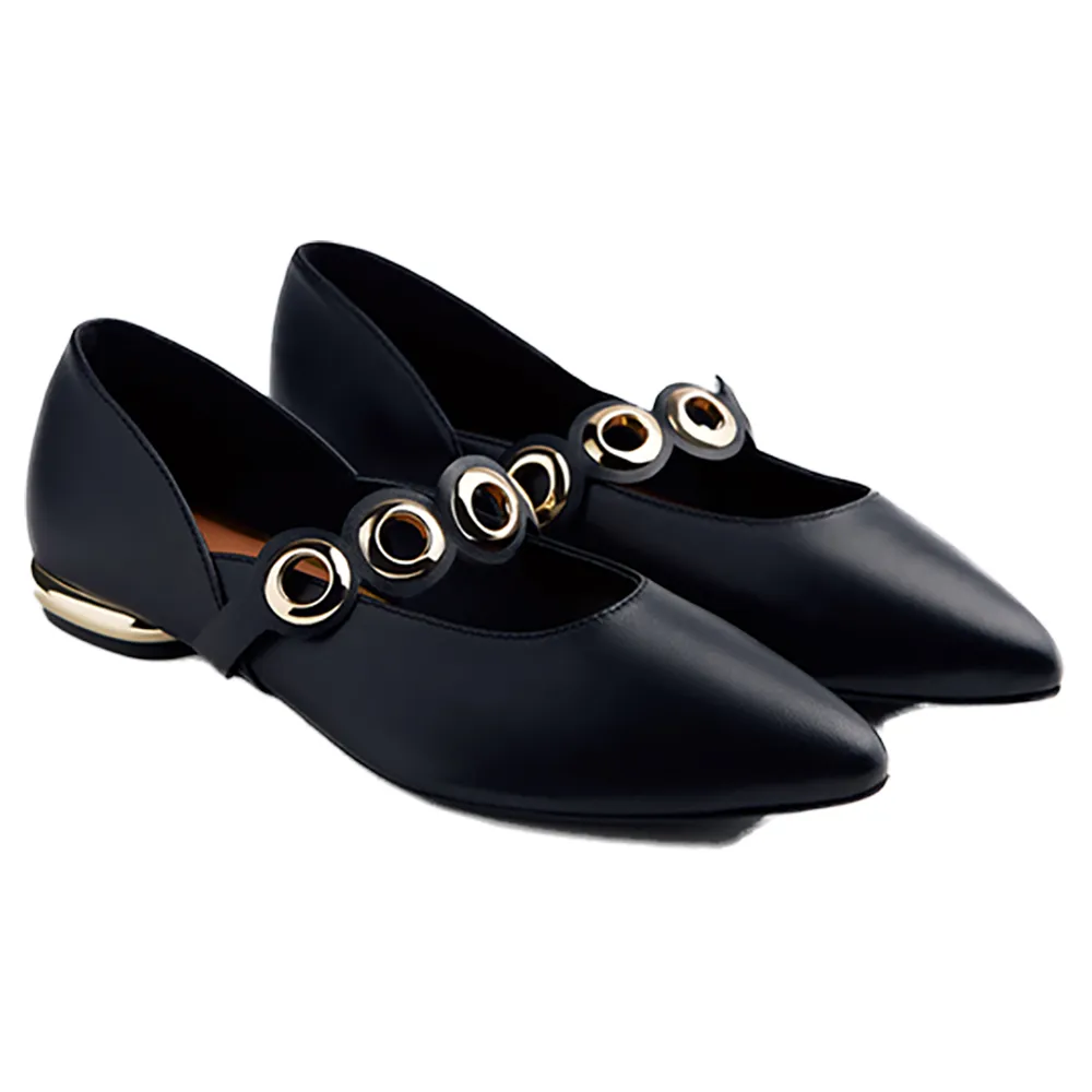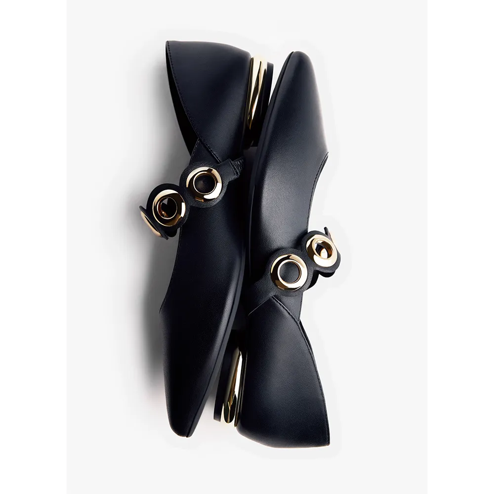 Кожаные балетки с золотистыми люверсами и металлическим каблуком.