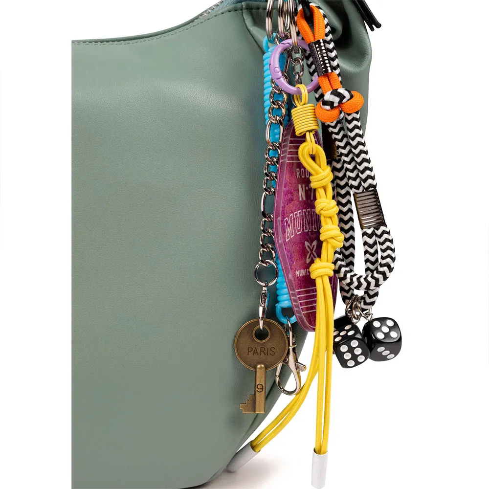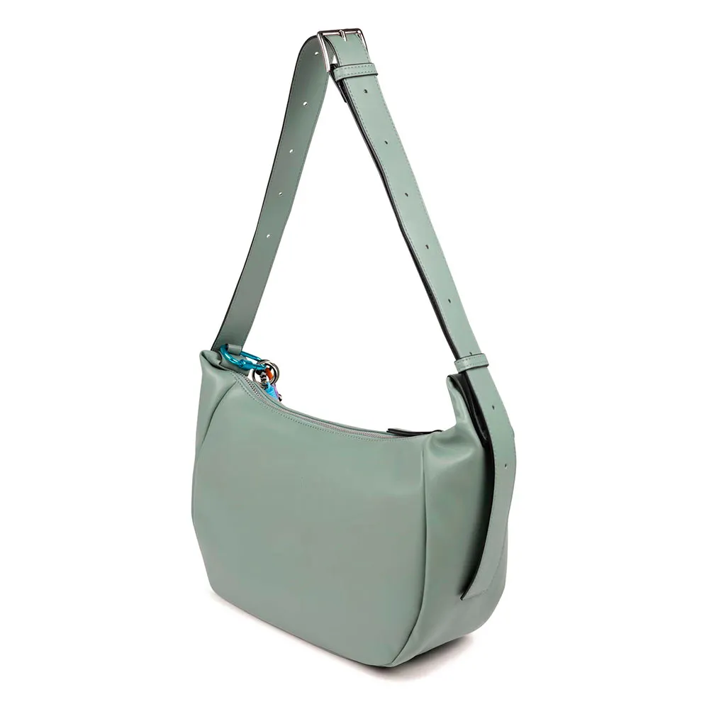 Сумка-хобо из полиуретана. Основное отделение на молнии. Деталь в виде съемных брелоков сбоку. Регулируемая ручка.