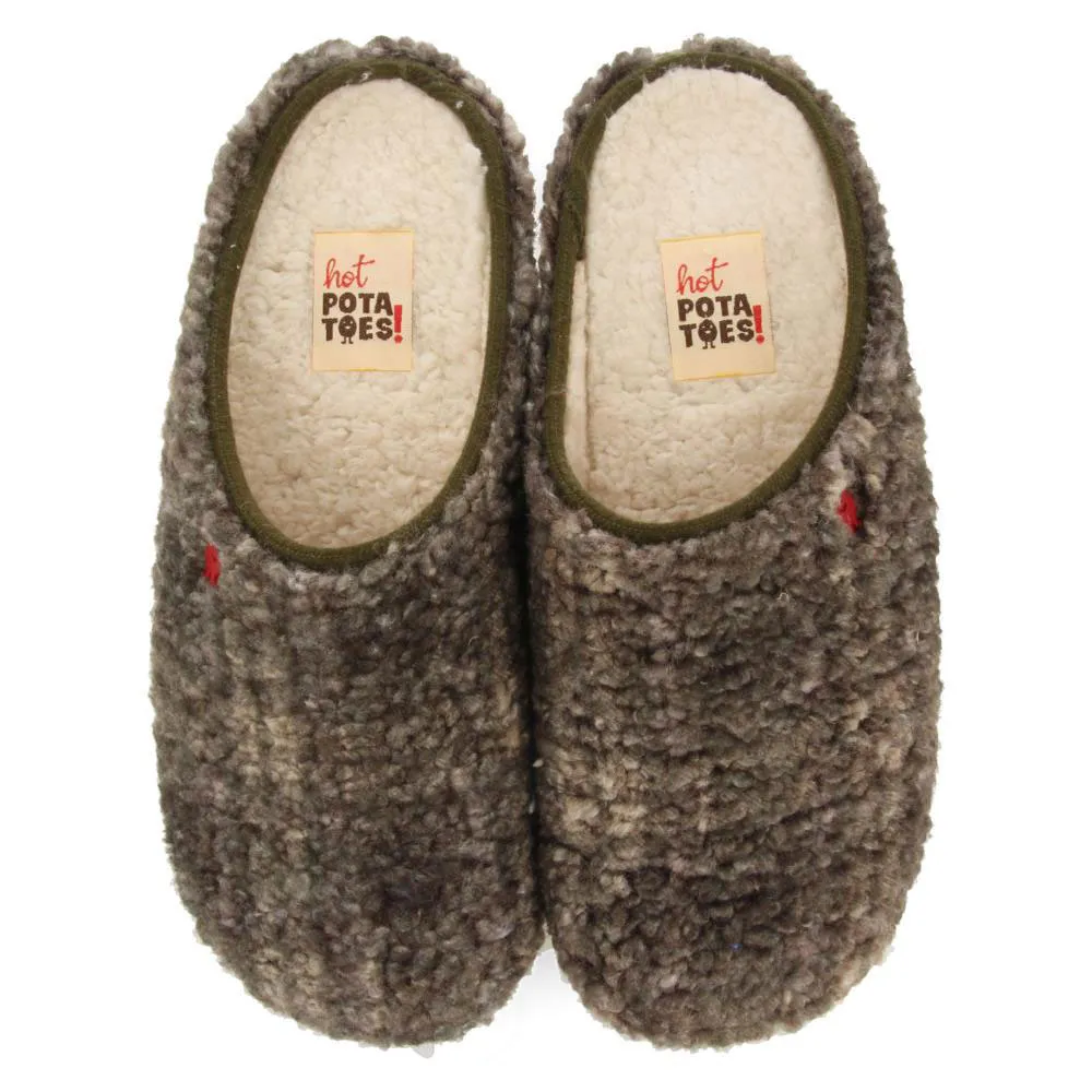 Откройте для себя непревзойденный комфорт с тапочками Hot Potatoes! Мужские домашние тапочки в стиле мюлей, изготовленные из овчины с принтом в оттенках хаки.