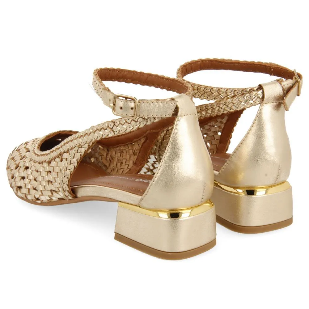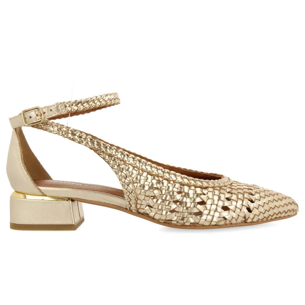 Балерины платинового цвета с ручной вышивкой, регулируемыми застежками и низким каблуком.