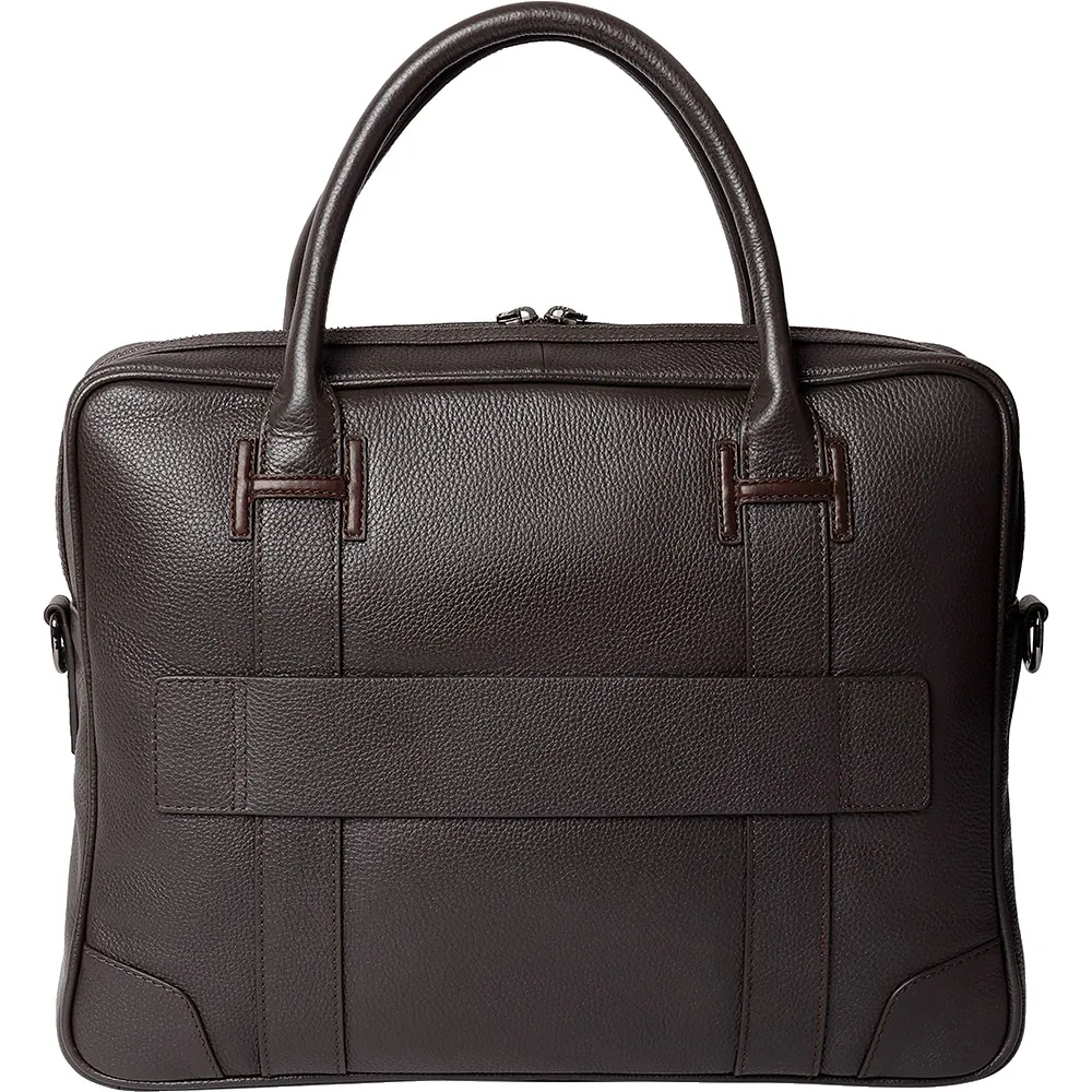 Этот портфель изготовлен из плотной матовой зернистой кожи с полированной контрастной отделкой в виде буквы «H».