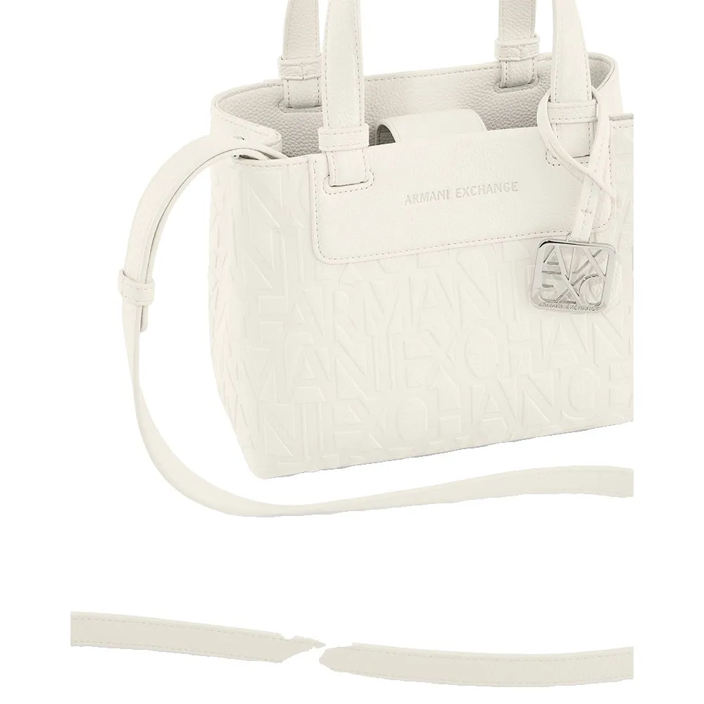 Семейство практичных полуструктурированных сумок изготовлено из прочных материалов с тисненым логотипом Armani Exchange по всей поверхности, украшенным накладкой из искусственной кожи с нанесенным методом термопечати тиснением корпоративным логотипом.