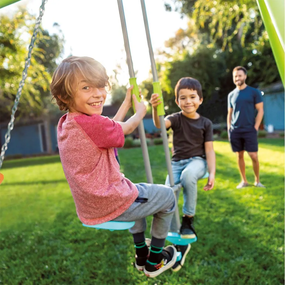 С другой стороны, двухместная качель обеспечивает максимальный комфорт благодаря подставке для ног и эргономичным нескользящим ручкам, которые позволяют легче держаться.